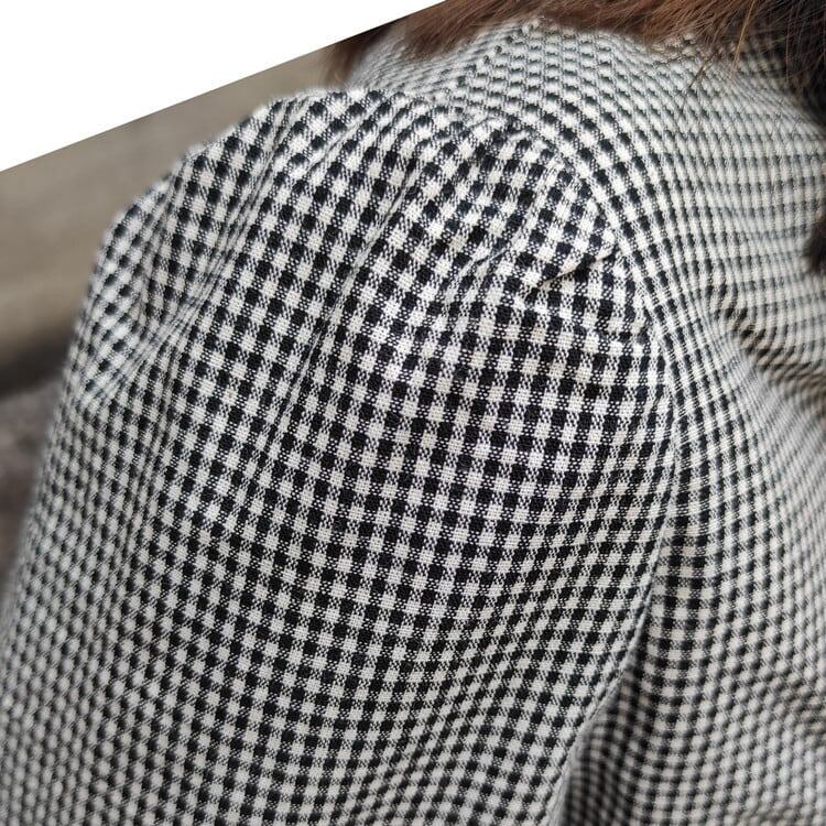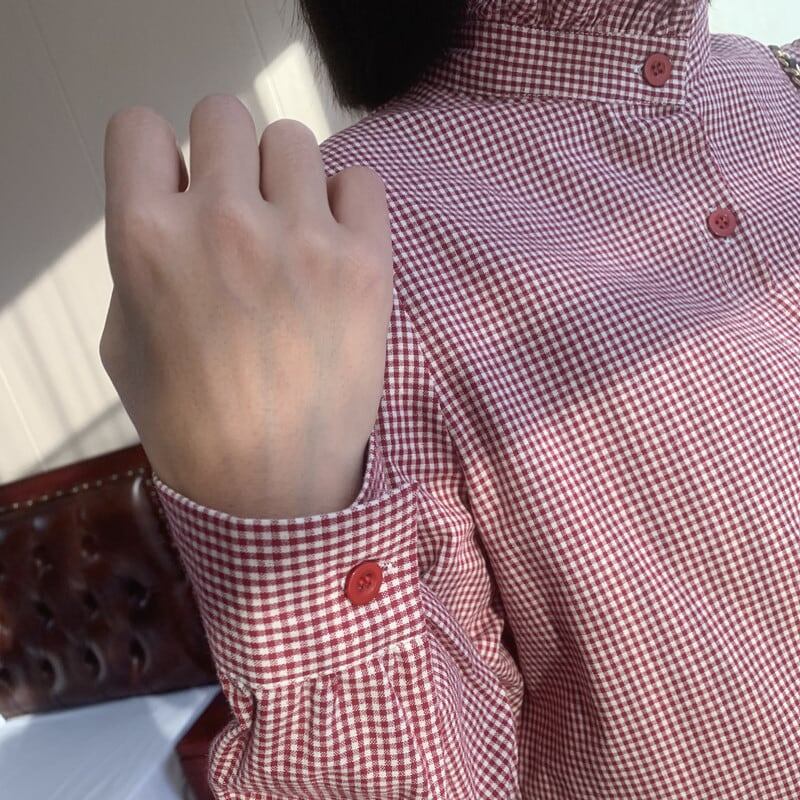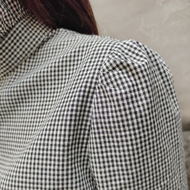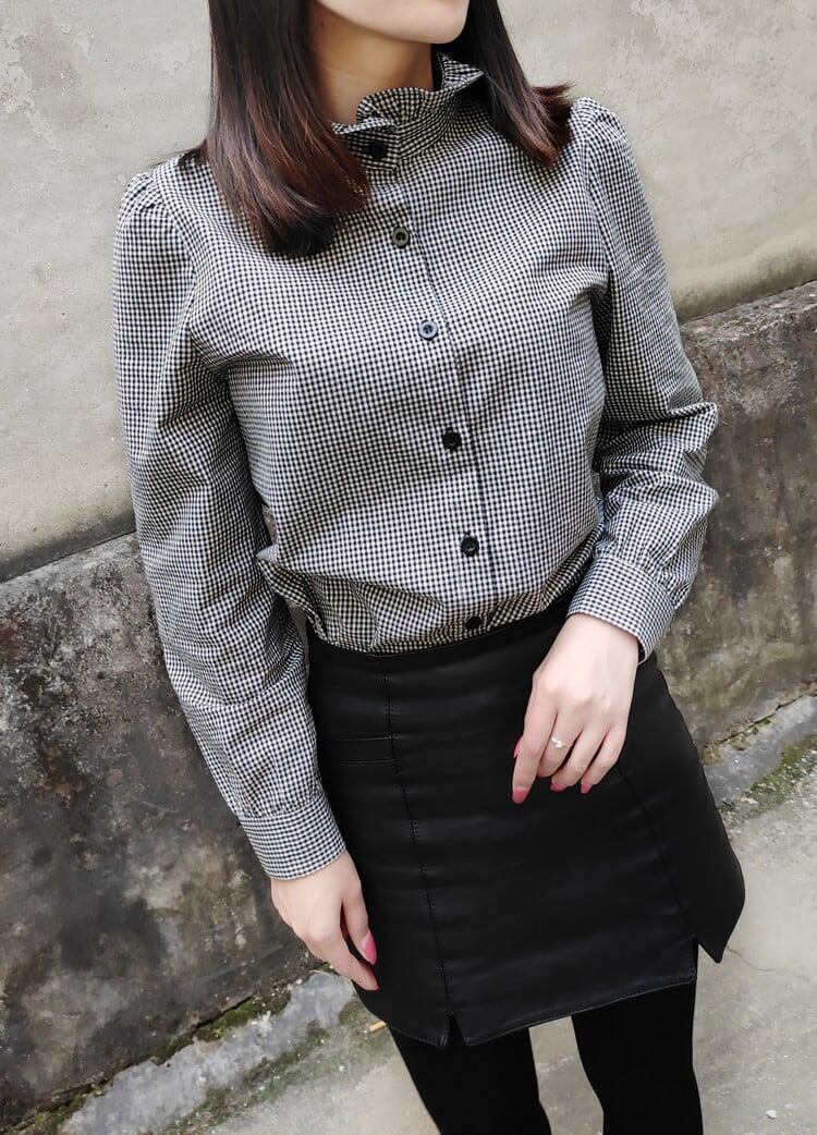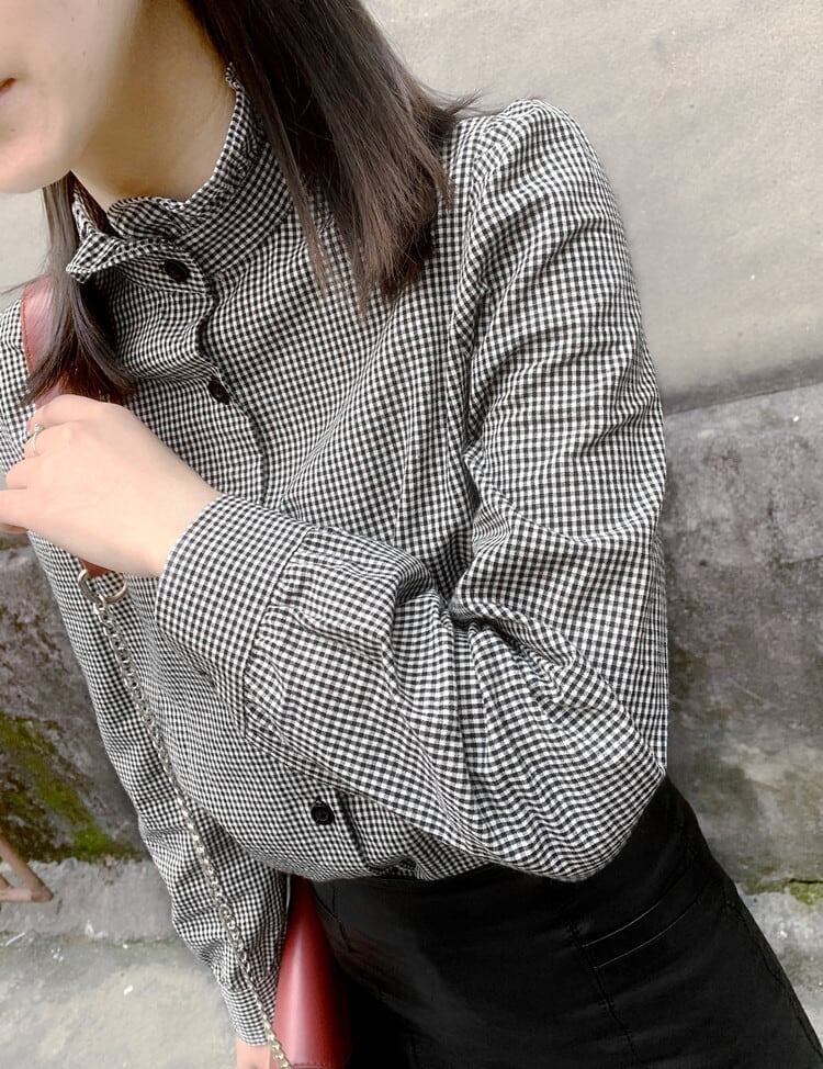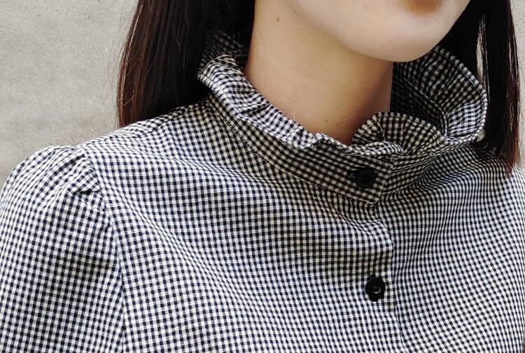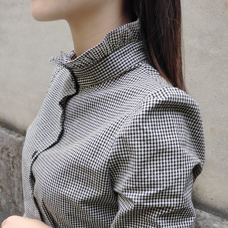 洗練されたスタンドカラーが魅力のギンガムチェックブラウス。