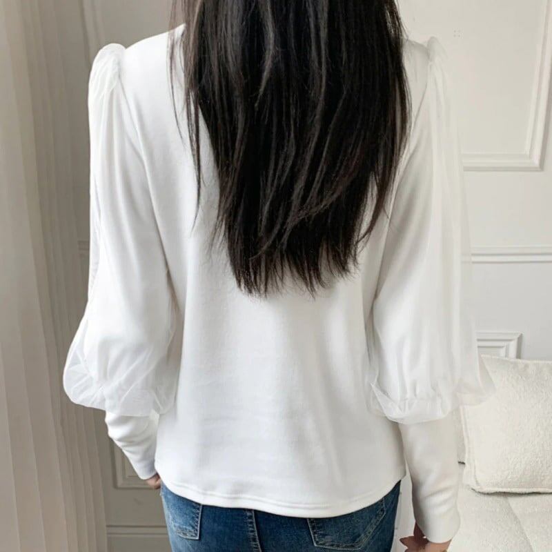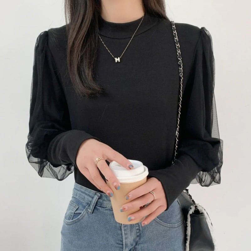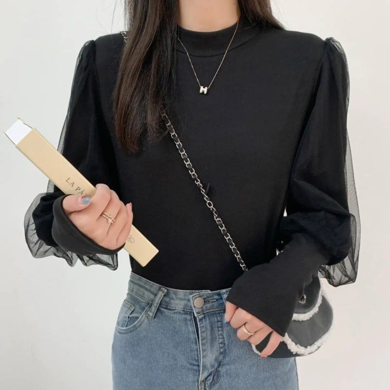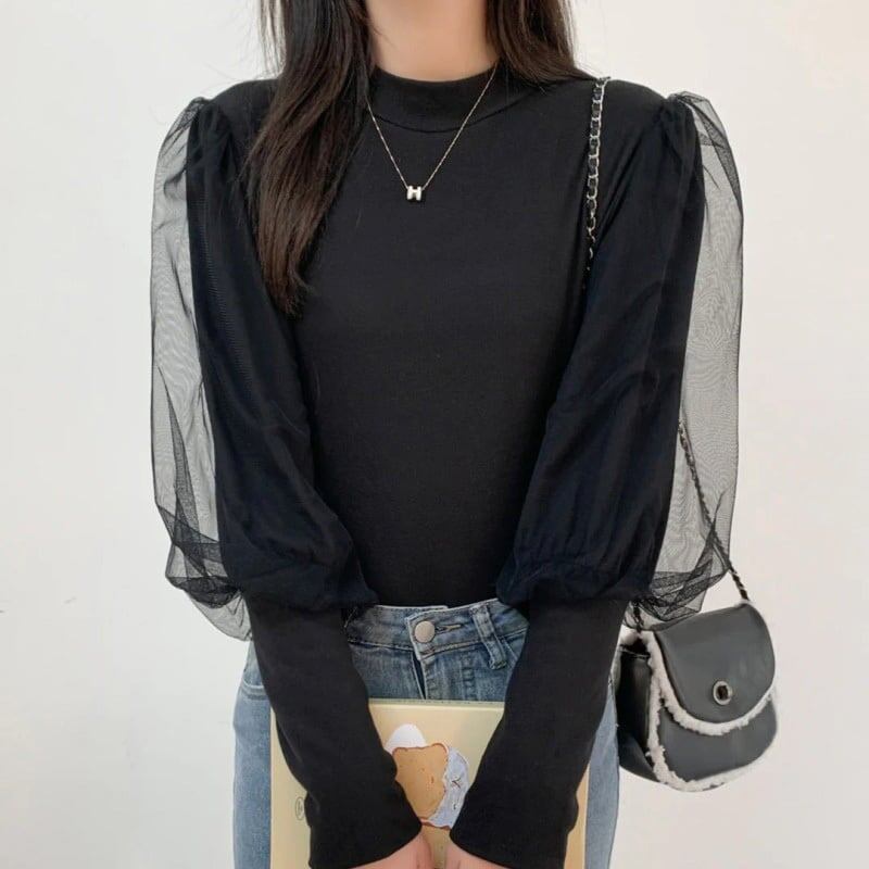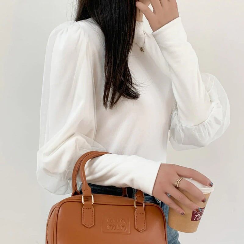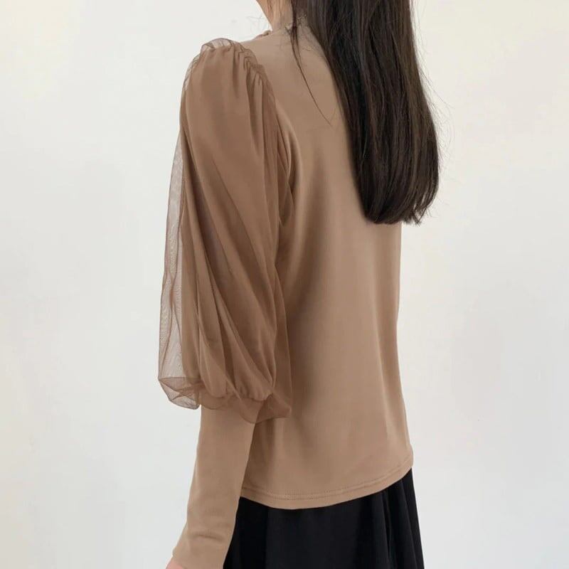 送料無料 レディース長袖カットソー 韓国ファッション バルーンスリーブ 無地 トップス 秋冬春 体型カバー 白 黒 茶 20代30代40代 きれいめ
