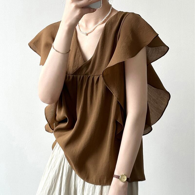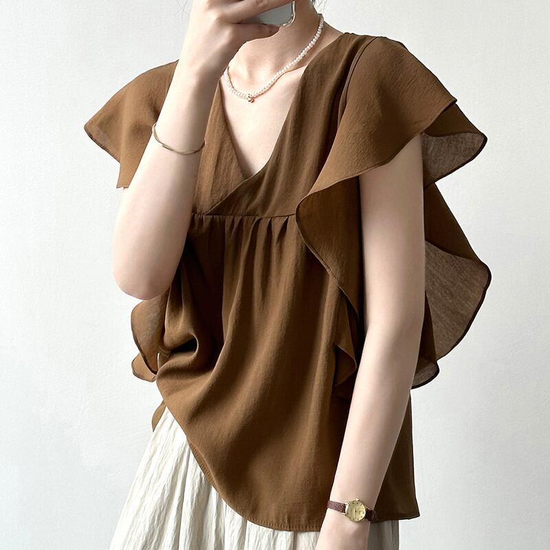 送料無料 ノースリーブカットソー レディース 大人可愛い 韓国ファッション フリル 背中開き 薄手 シンプル ブラウン 春夏 20代30代40代
