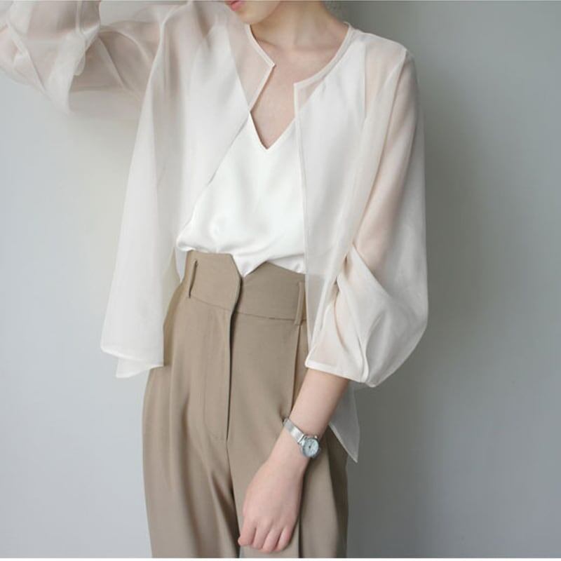 シフォン素材で軽やかな着心地、フォーマルにもカジュアルにも◎。