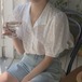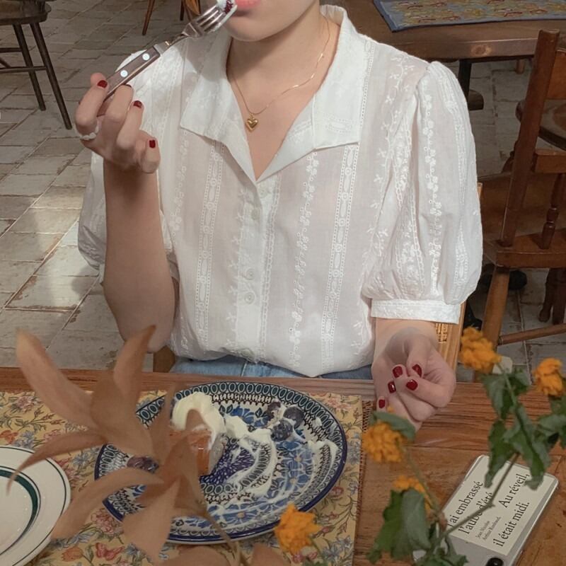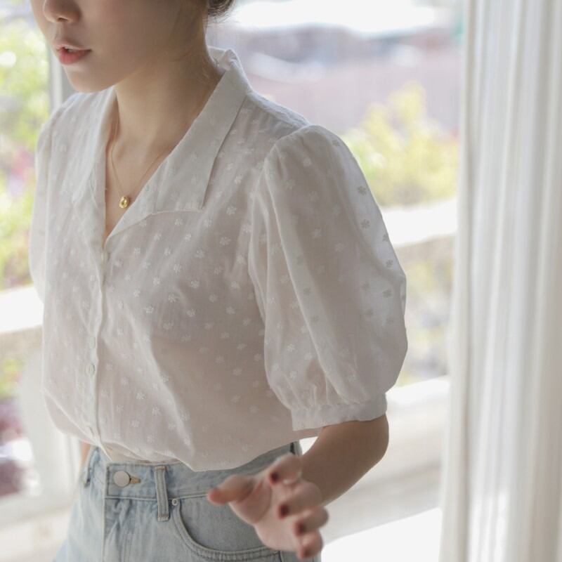 送料無料 レディース 白小花柄ブラウス 半袖 シャツ襟付き 春夏秋冬 韓国ファッション 大人可愛い 20代から30代 きれいめ カジュアルスタイル