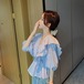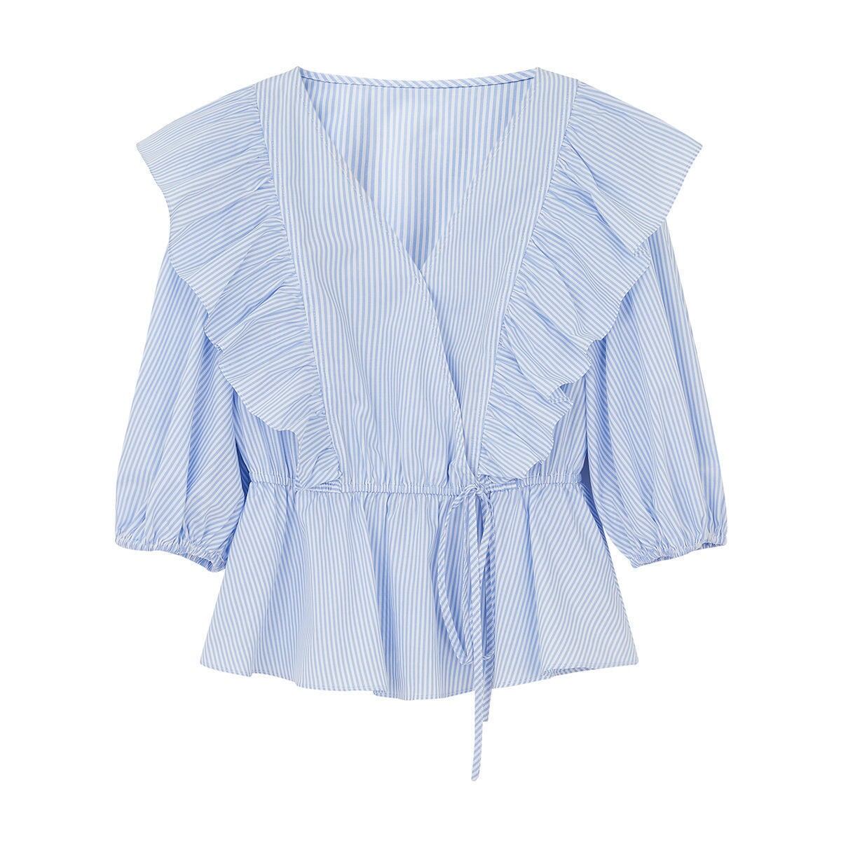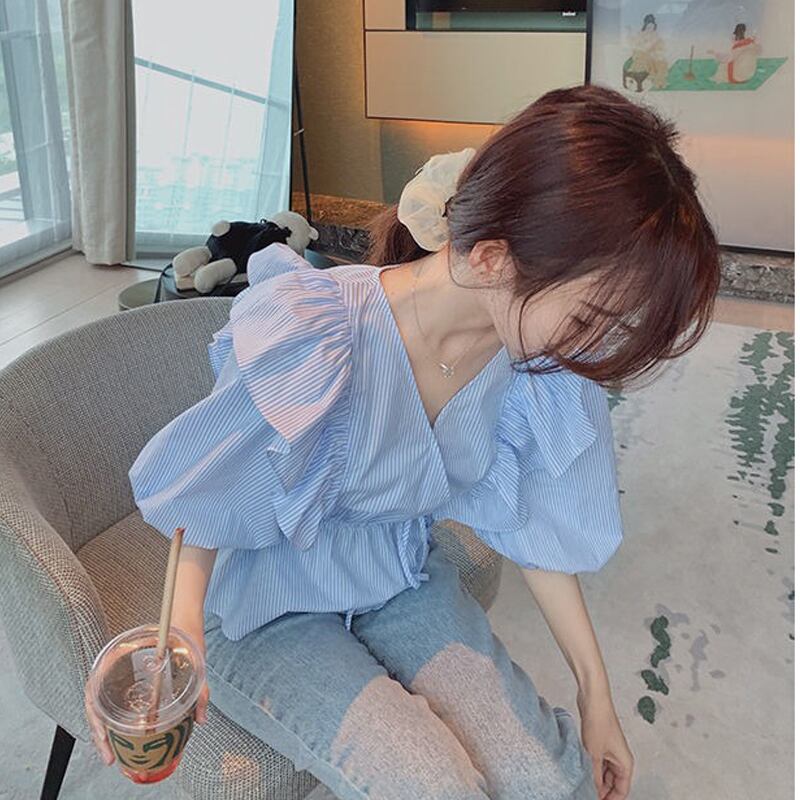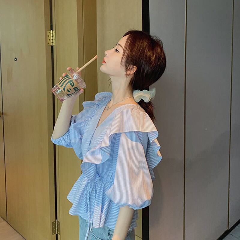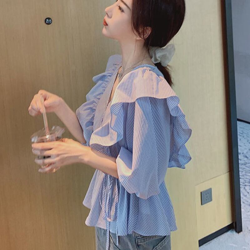 送料無料 春新作 レディース ストライプ半袖ブラウス ブルー フリル きれいめコーデ 大人カジュアル 韓国ファッション 20代30代40代向け