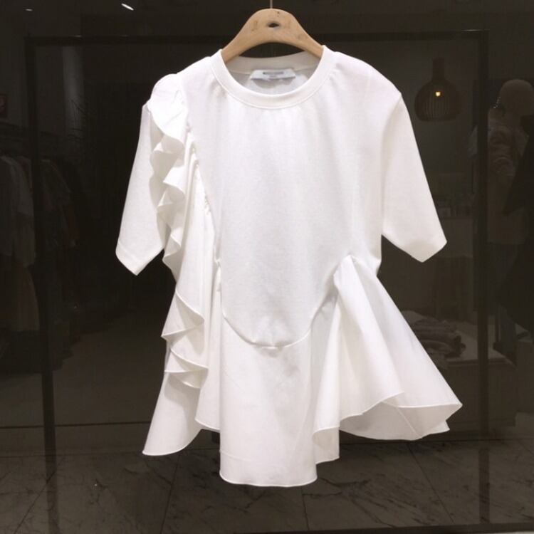 送料無料 春新作 レディース ブラウス 韓国風 フリル半袖 無地 ベーシックカラー 春秋 通勤 オフィス フォーマル 大人可愛い シャツ トップス