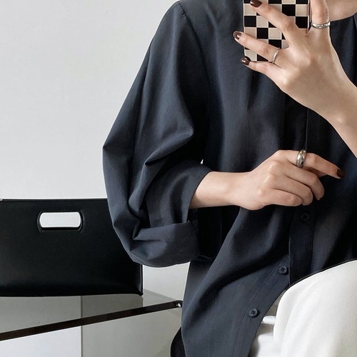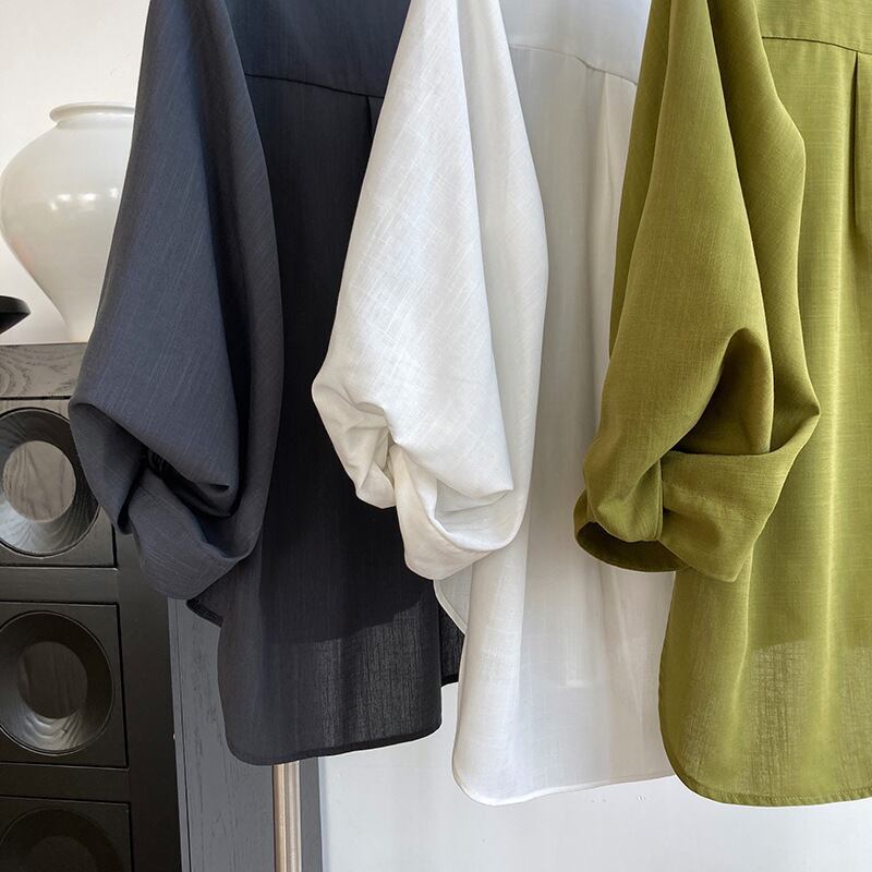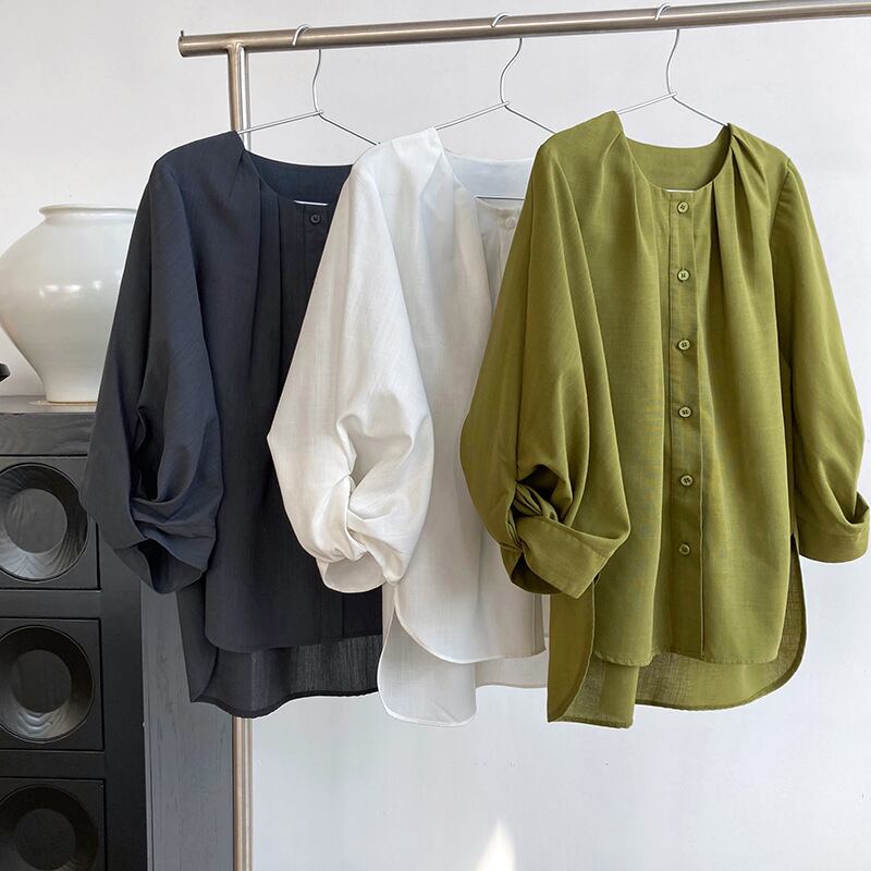 送料無料 レディースブラウス 韓国風 無地 ボリュームスリーブ ゆったり 体型カバー オフィス ラウンドネック ホワイト ブラック グリーン