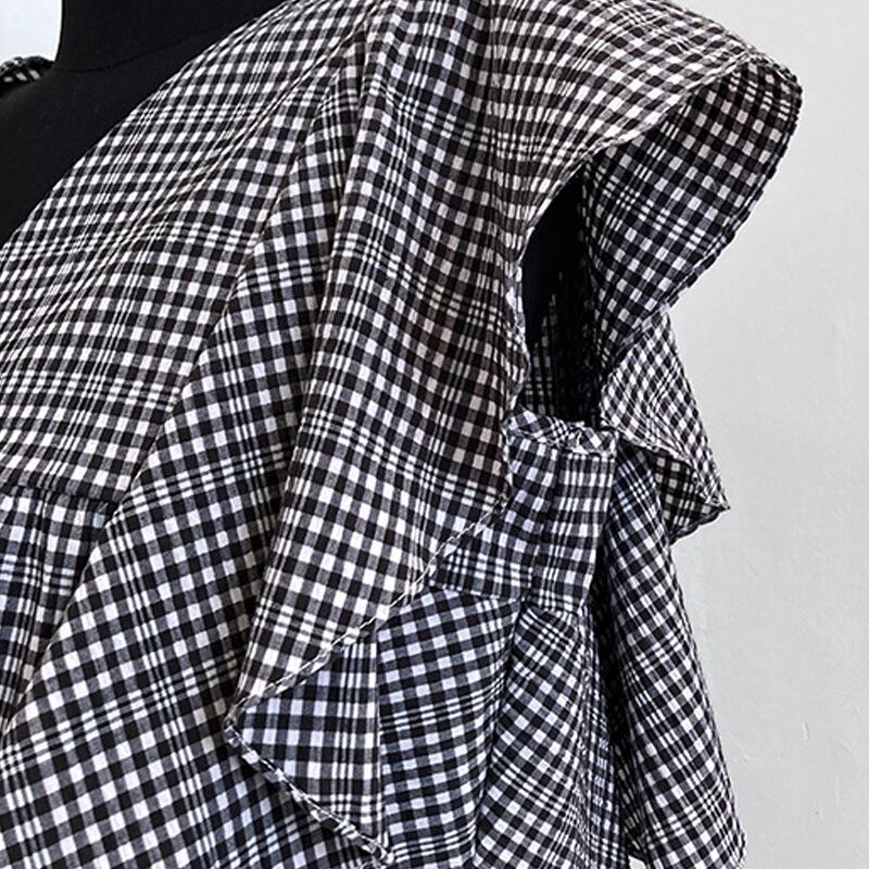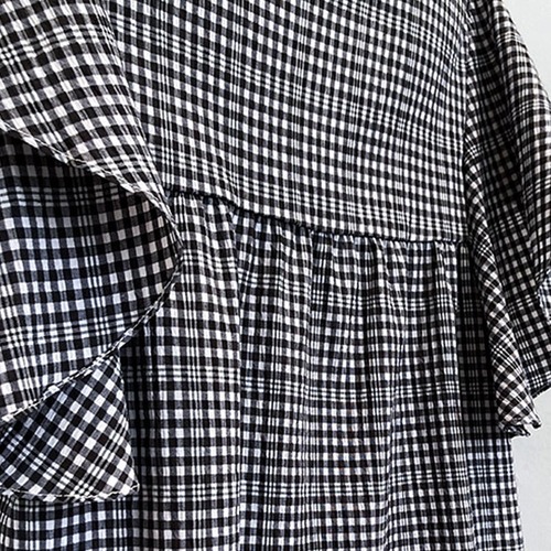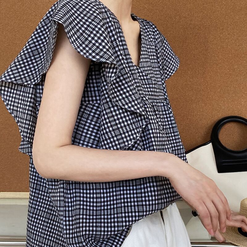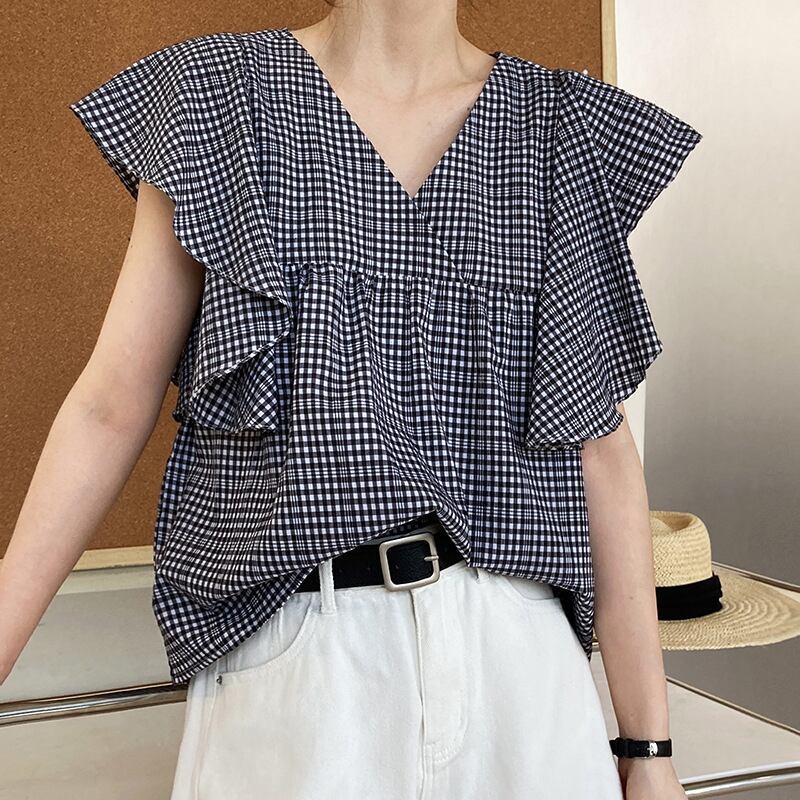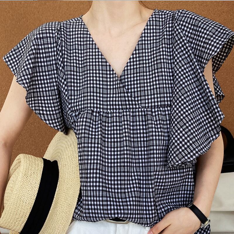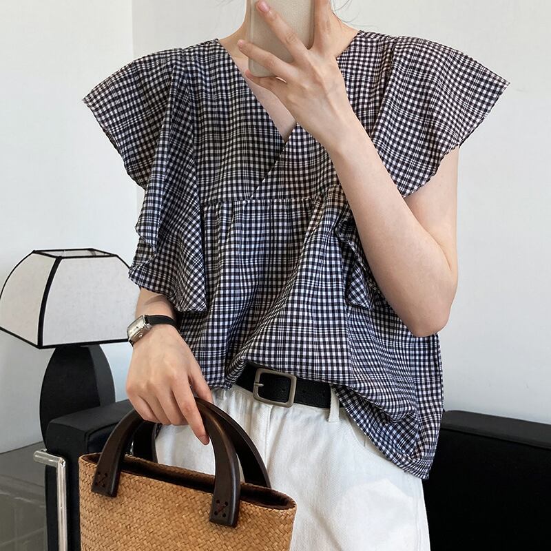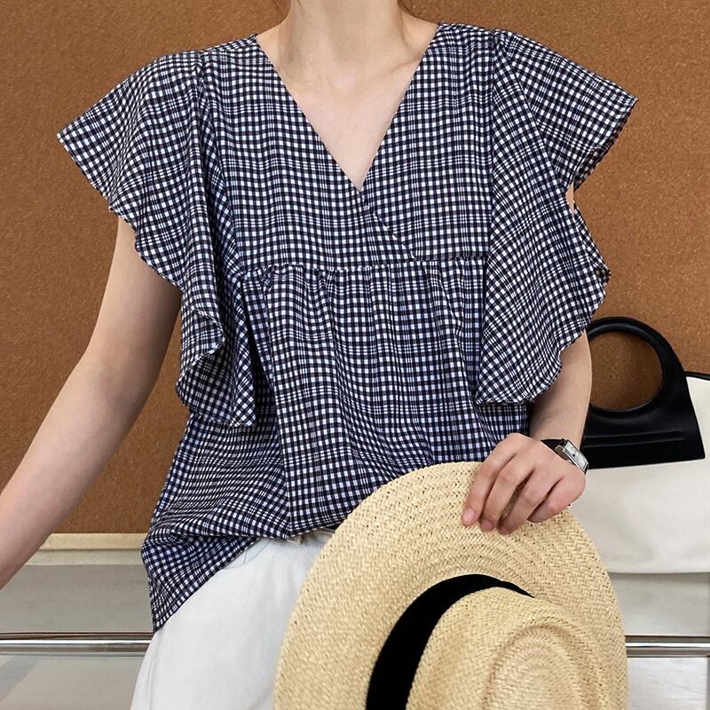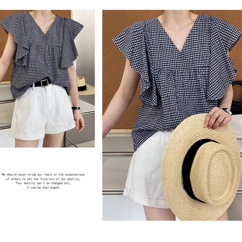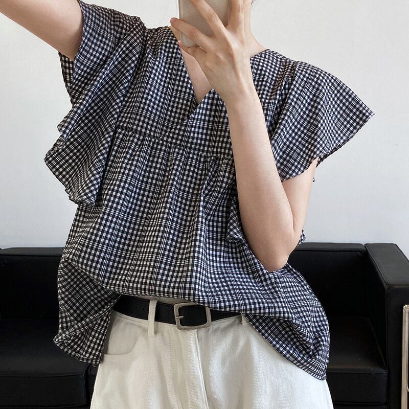 送料無料 春新作レディースブラウス 体型カバー ゆったりシルエット フレンチスリーブ 無地 ギンガムチェック 韓国ファッション オフィス30代40代