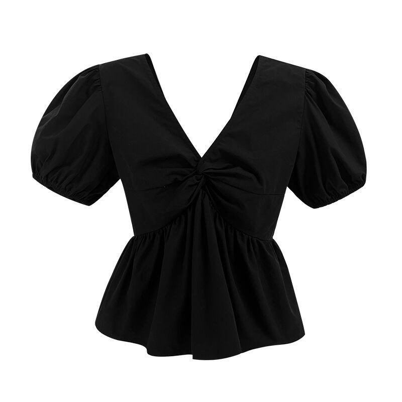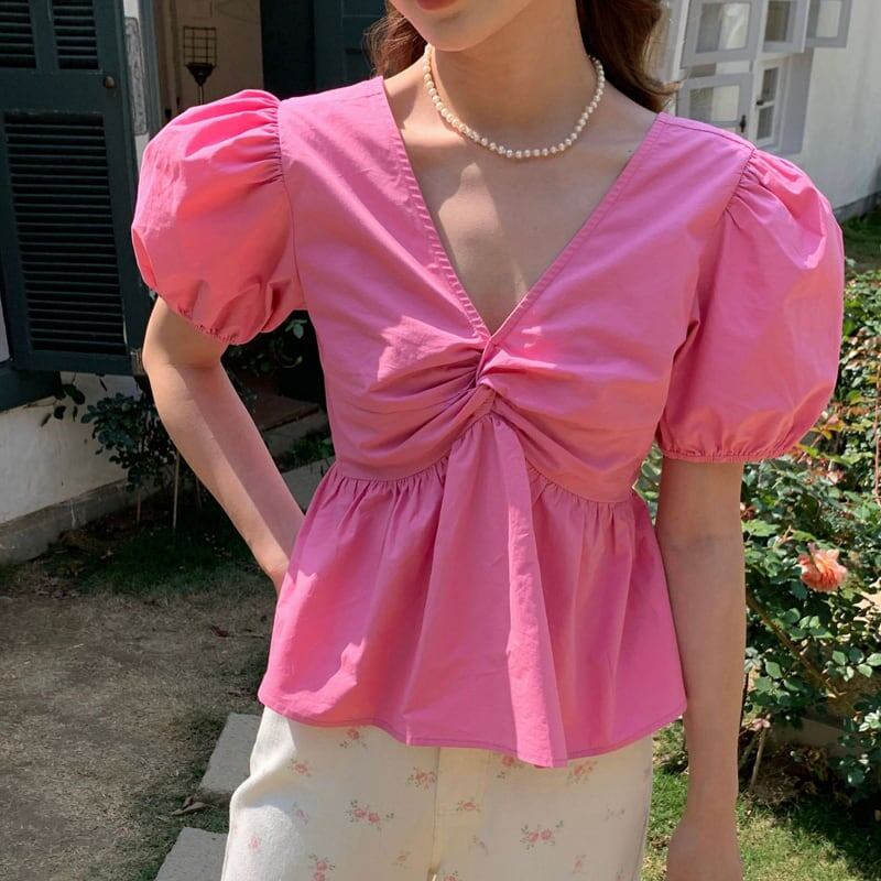 送料無料 レディース春秋コーデ韓国風無地シンプルパフスリーブブラウス 半袖 オフィスカジュアル 大人可愛いトップス ピンク ホワイト ブラック