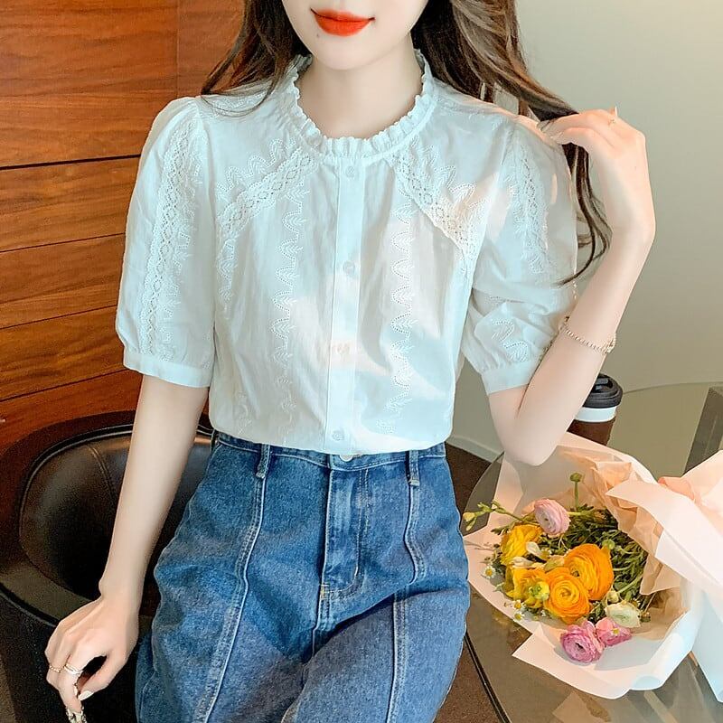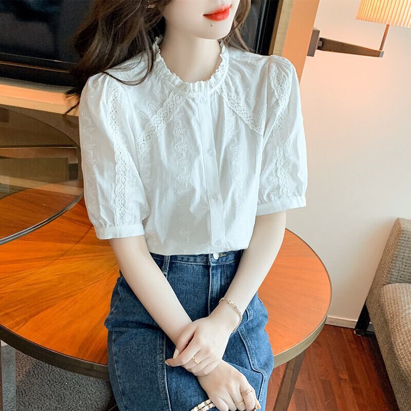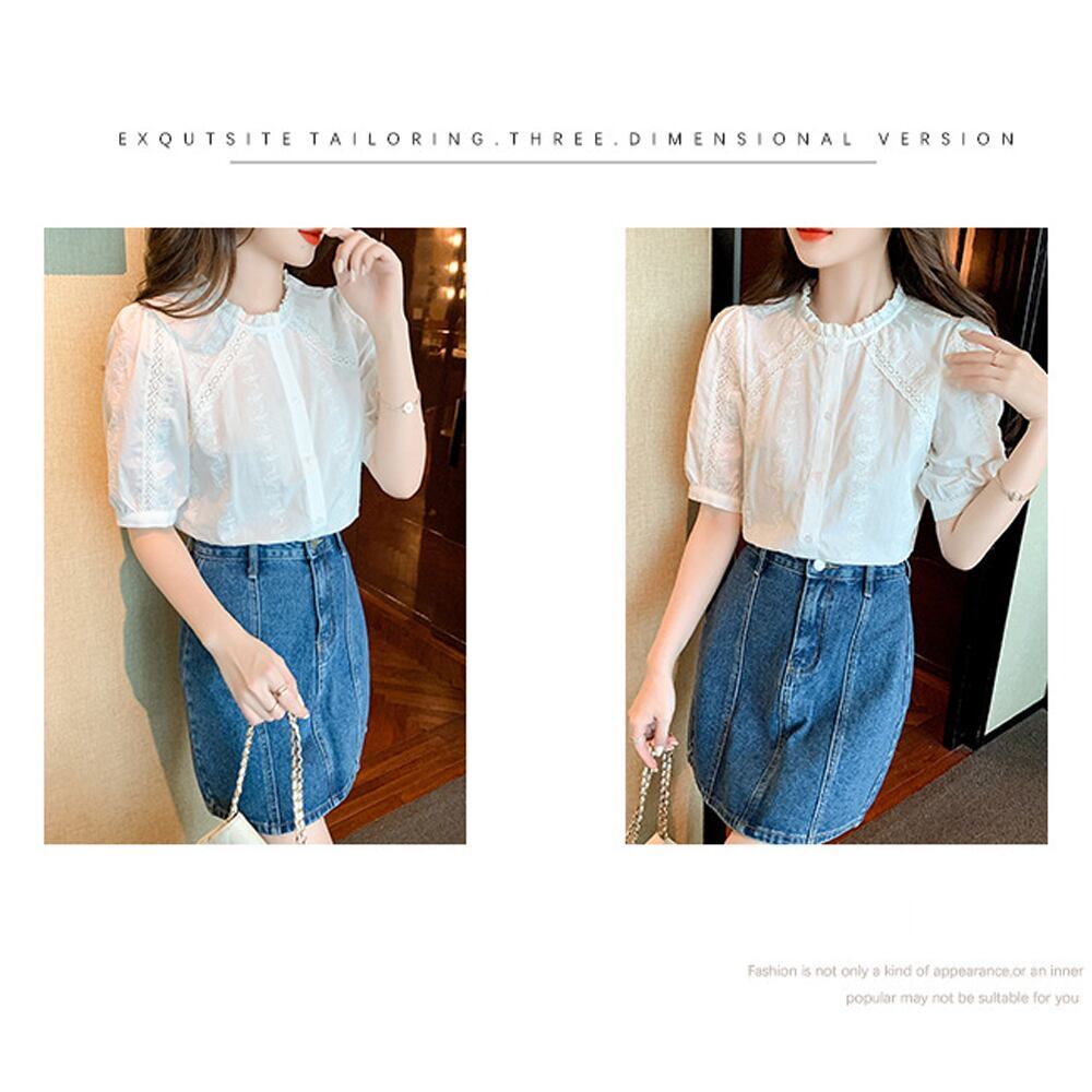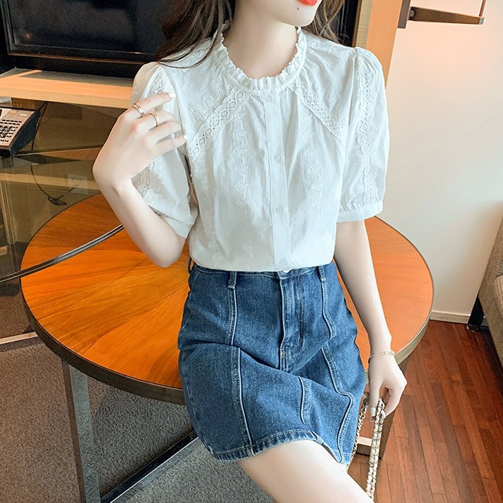 送料無料 レディース韓国風透け感シフォンフリルレースブラウス シャツ 春秋冬 オフィス通勤フォーマル きれいめ 大人可愛い 大きいサイズ 半袖花柄白