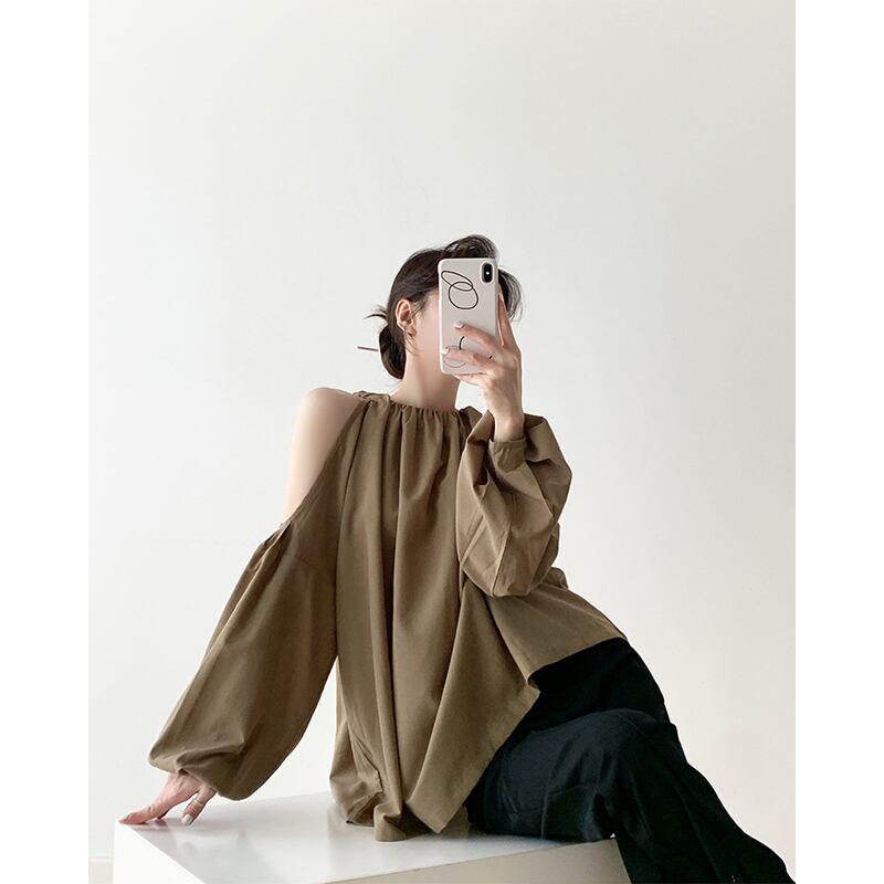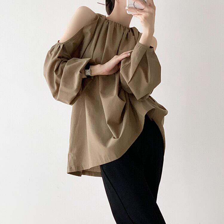 送料無料 レディースオフショル長袖ブラウス 春新作 大人可愛い 韓国風 ボリューム袖 ブラウン フォーマル オフィスカジュアル 春秋冬コーデ