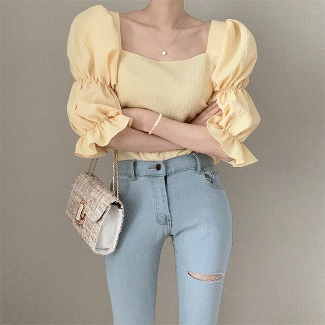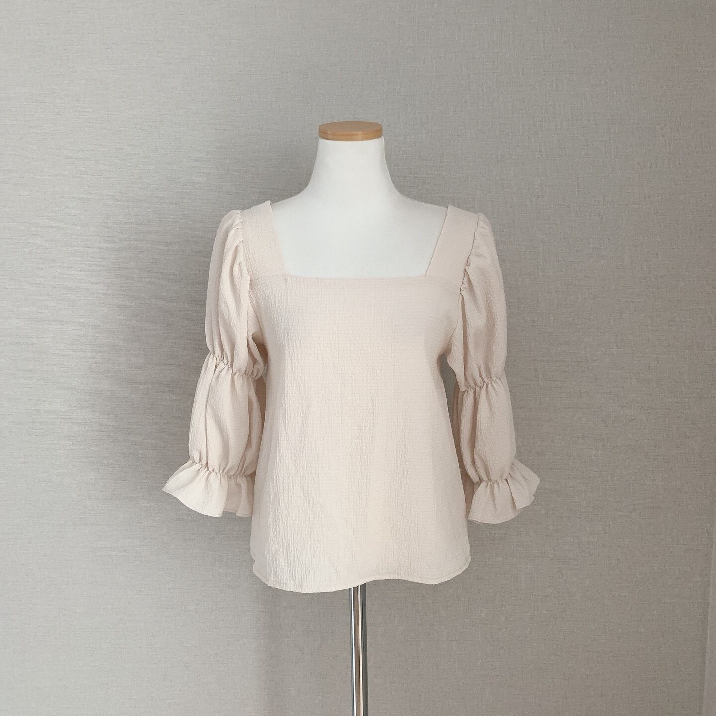 春の新作、スクエアネックが魅力のパフスリーブブラウス。