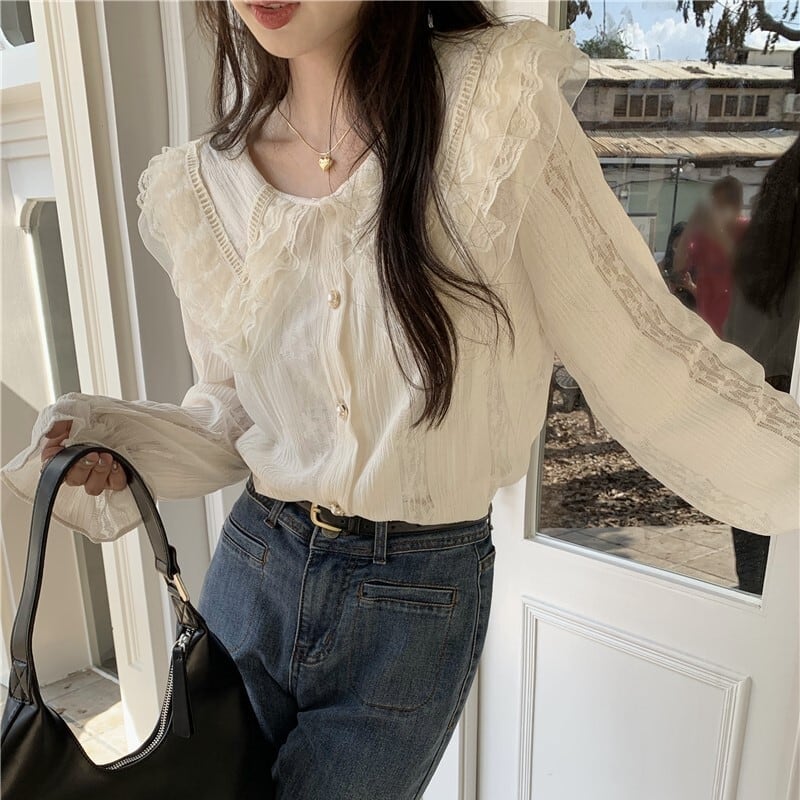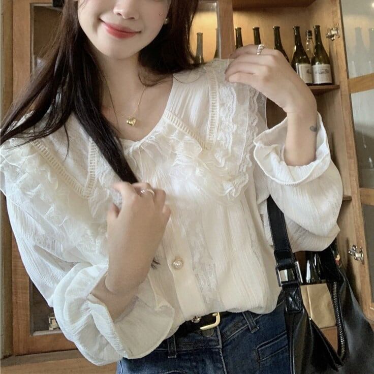 送料無料 レディース シャツブラウス シフォン フリル襟 レース 長袖 白 フォーマル オフィス 大人可愛い 韓国風 春秋冬オールシーズン