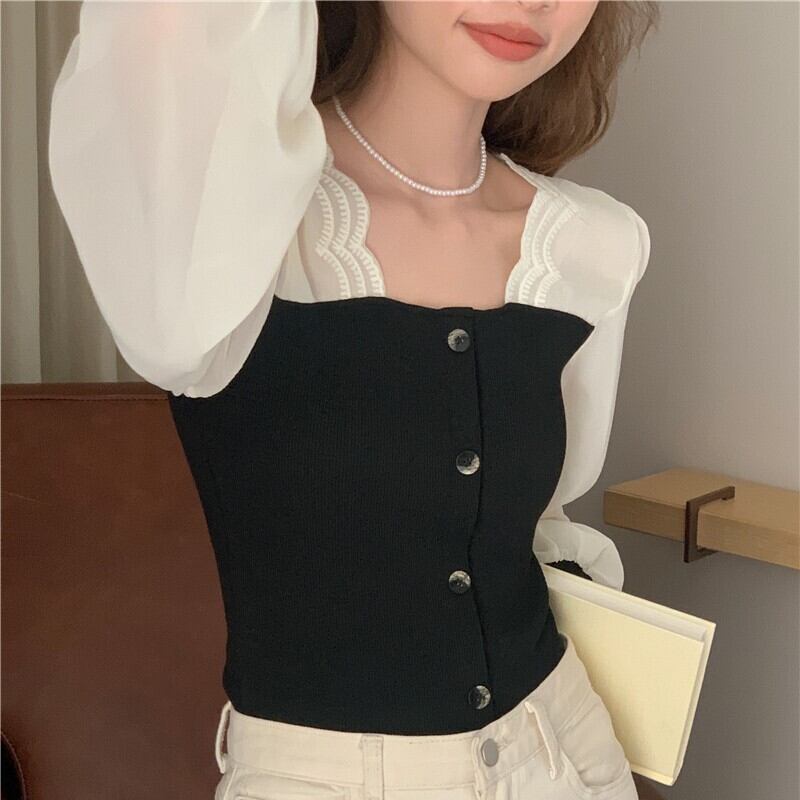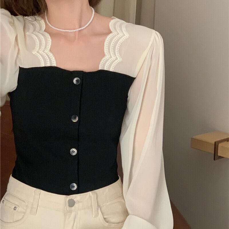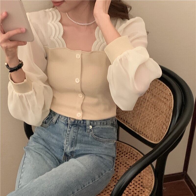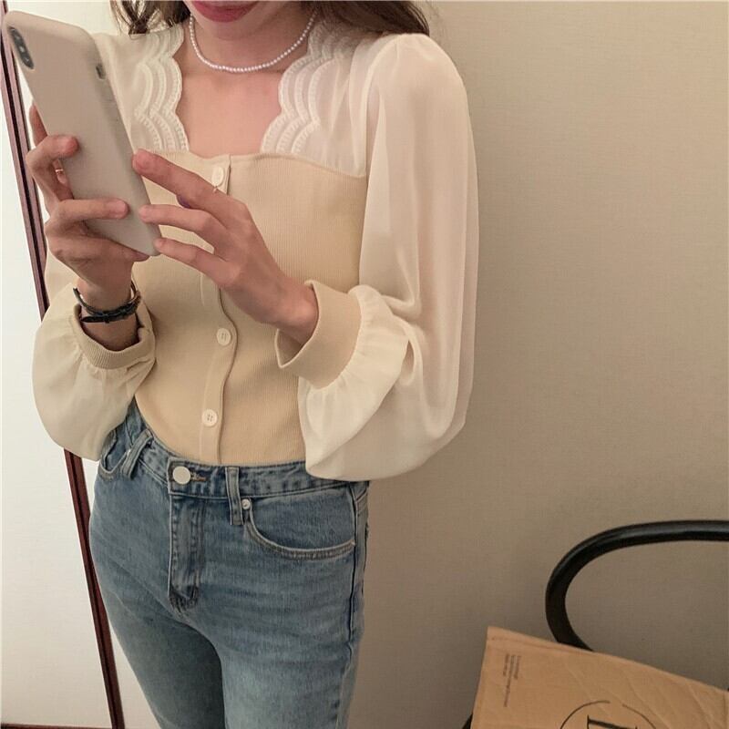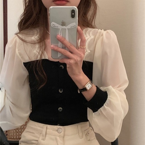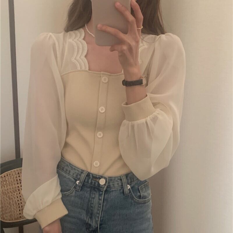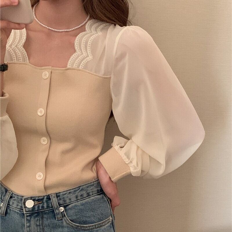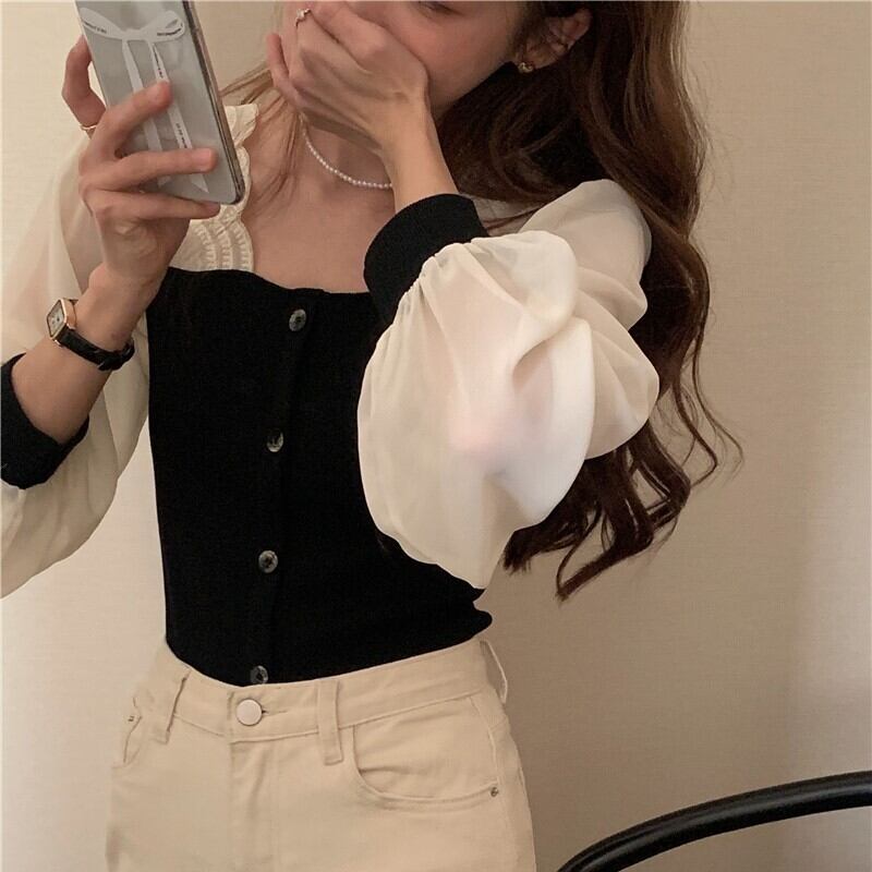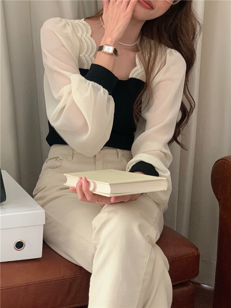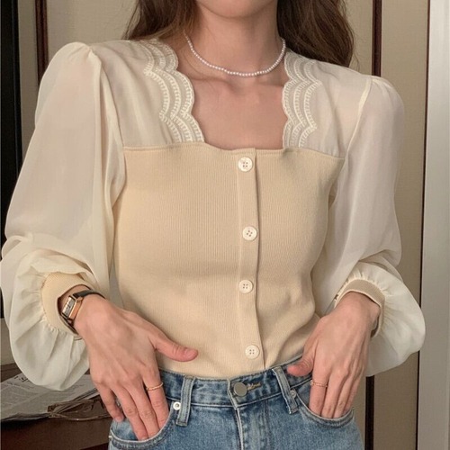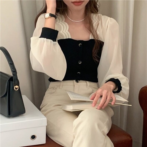 送料無料 レディース シースルースリーブ リブニットブラウス 長袖 レースフリル 黒 大人可愛い フォーマル 韓国ファッション オフィス 通勤