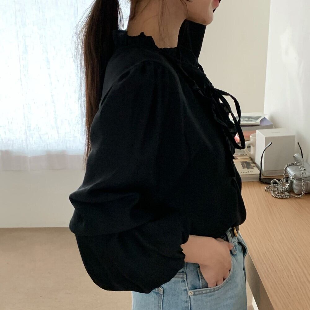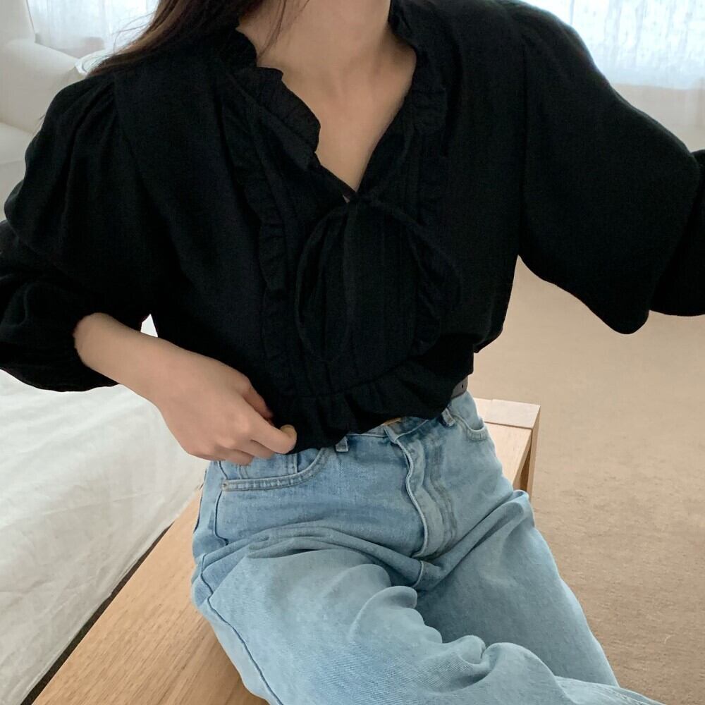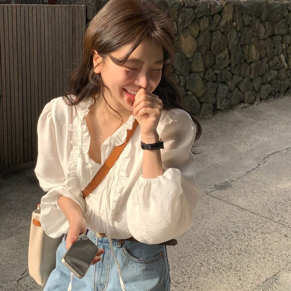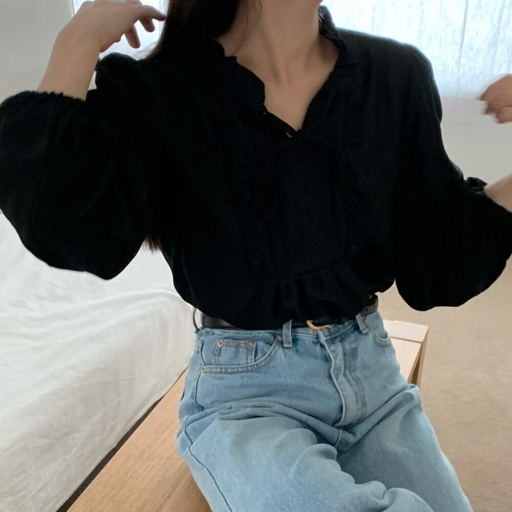 送料無料 レディースシャツブラウス フリル長袖 春新作 春秋冬 通勤 オフィスフォーマル 大人可愛く着回し抜群 韓国ファッション 白 黒