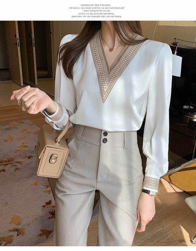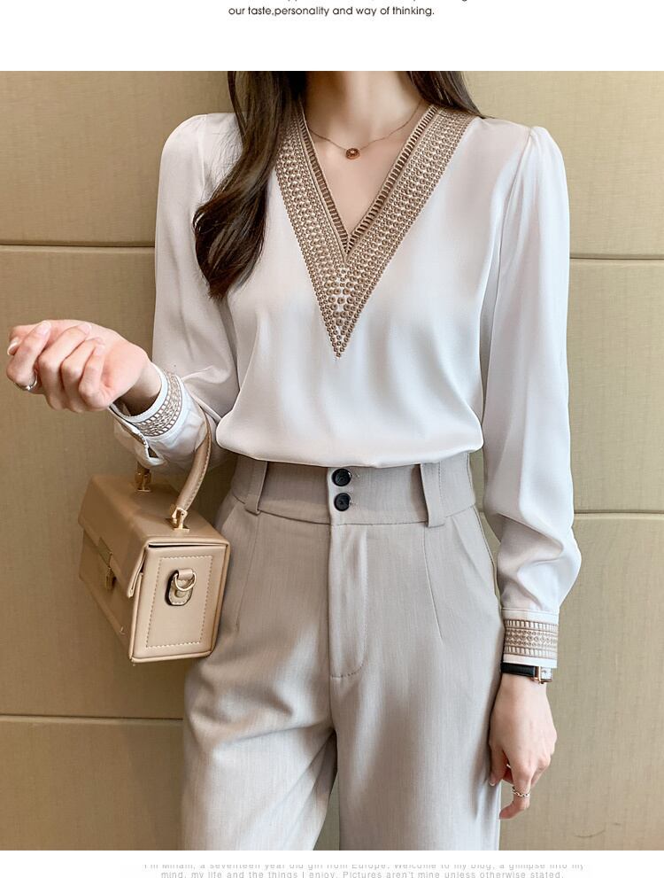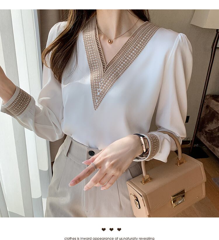 送料無料 レディース シフォン Vネック長袖ブラウス 白 フェミニン 大人可愛い 春秋冬用 フォーマル ビジネス オフィス通勤用 韓国ファッション