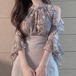 送料無料 春新作 レディースシフォン素材フリル花柄ブラウス 春秋冬対応 大人可愛い フェミニン 通勤 オフィス フォーマル 韓国ファッション