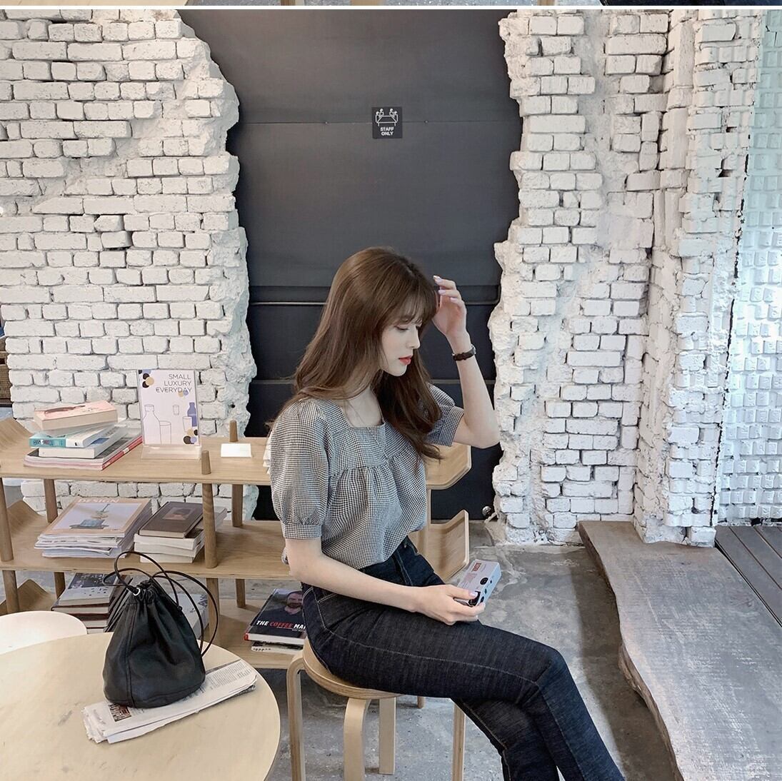 送料無料 レディースブラウス 長袖 韓国風 ギンガムチェック スクエアネック 大人可愛い 白黒 おしゃれ オフィスカジュアル 大きいサイズ 春秋冬