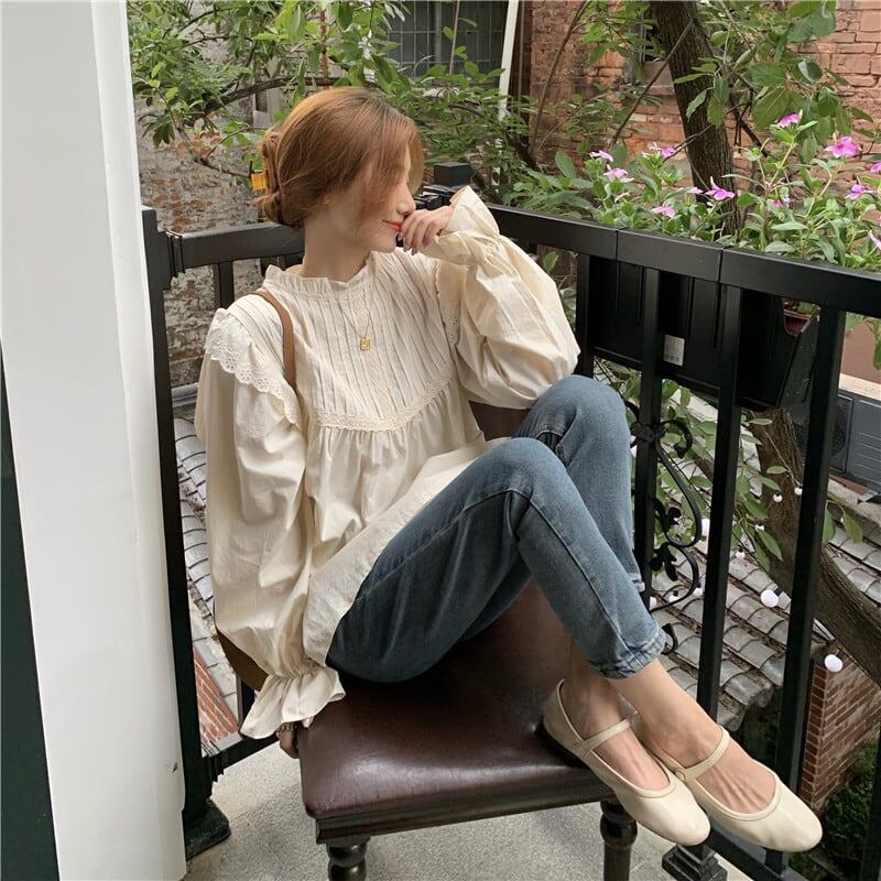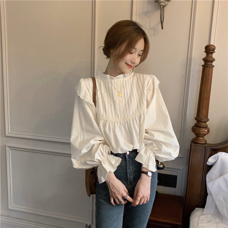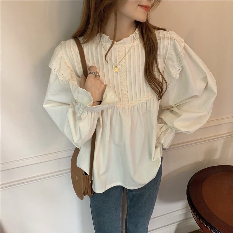 送料無料 秋新作 レディース シフォンレースフリル長袖シャツブラウス 白 大人可愛い きれいめ系 上品 春秋冬オフィスビジネス通勤トップス