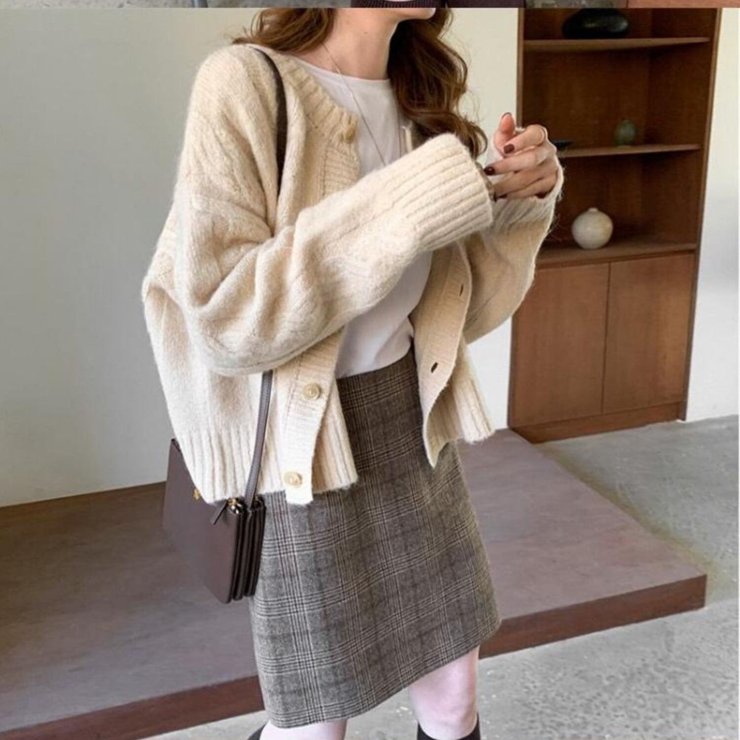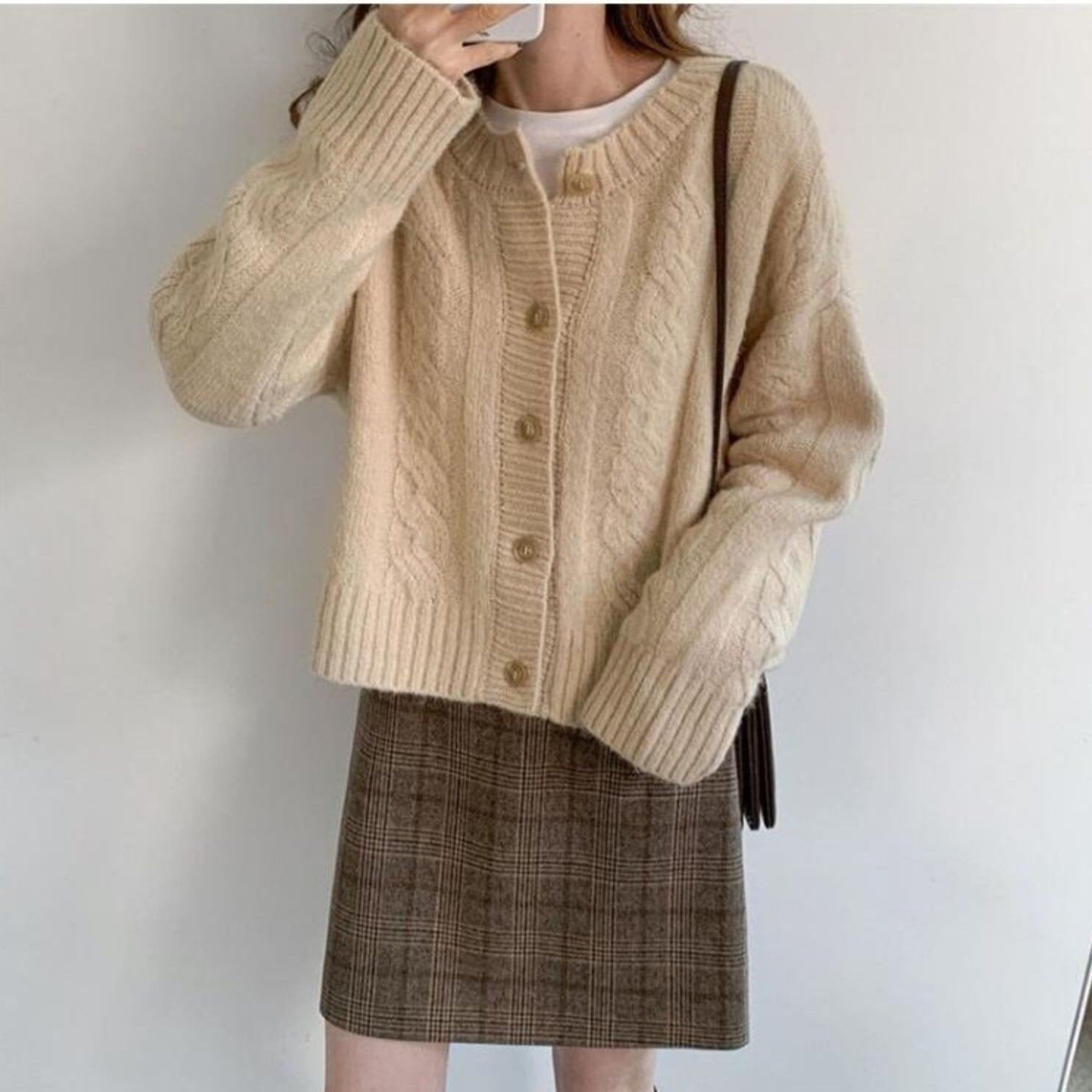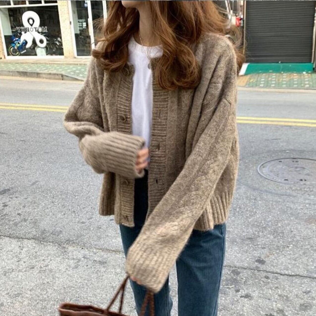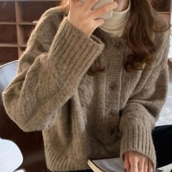 送料無料 レディース 厚手ケーブルニットカーディガン ショート丈 長袖 無地 ラウンドネック ラテカラー 秋冬 カジュアル 韓国ファッション トップス