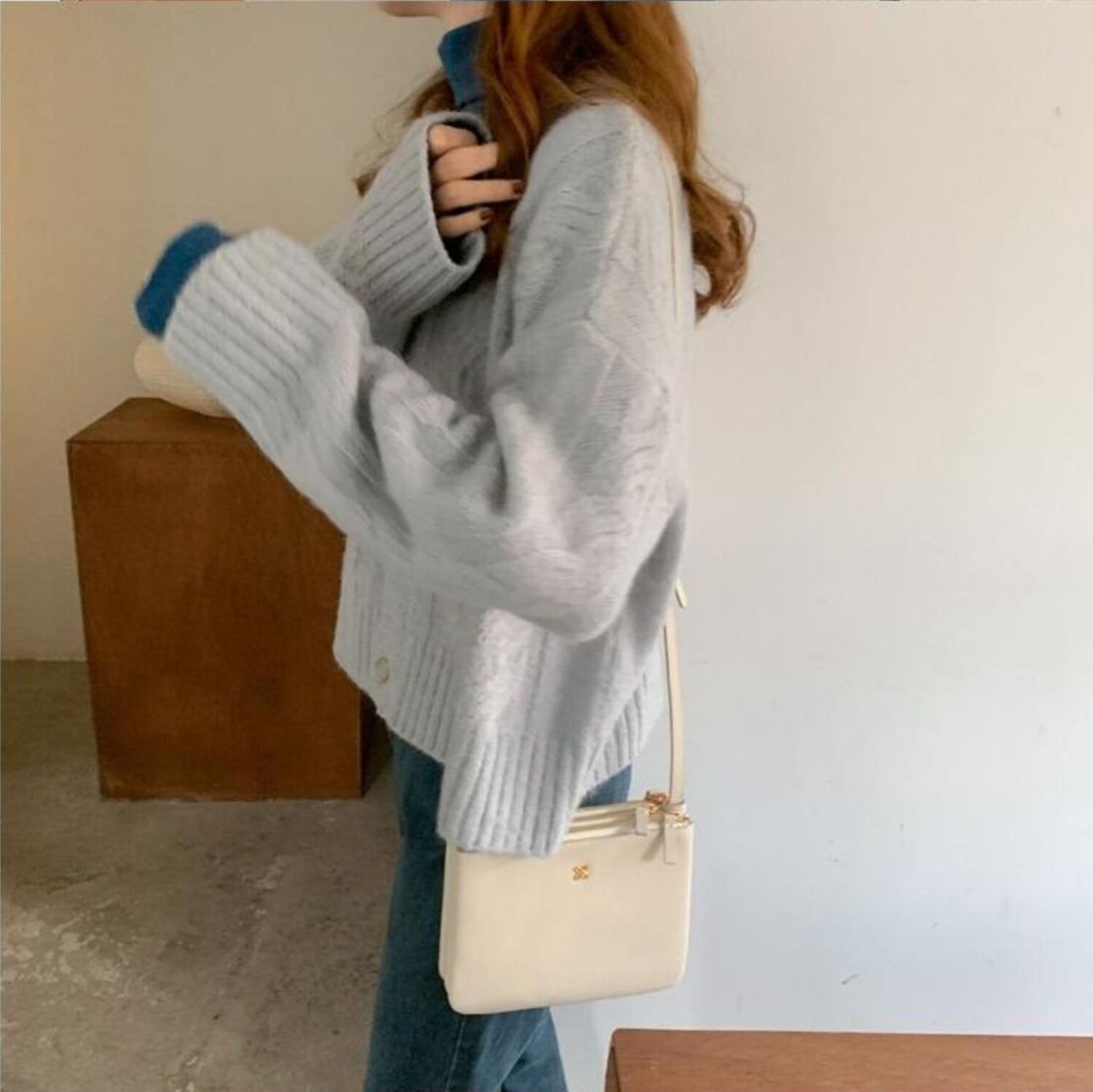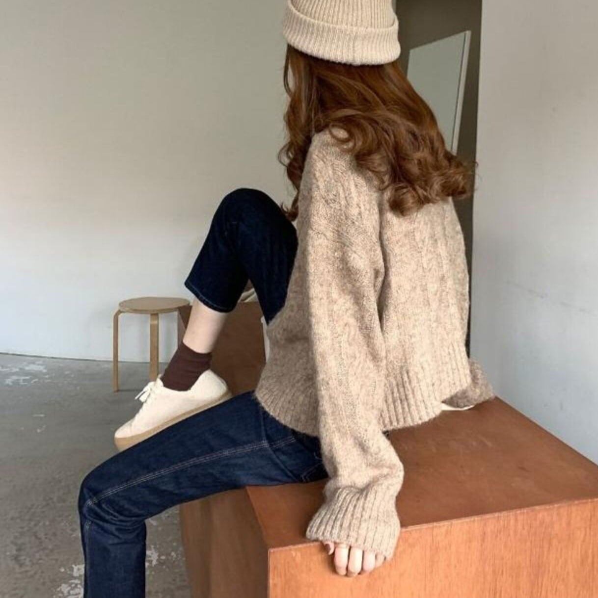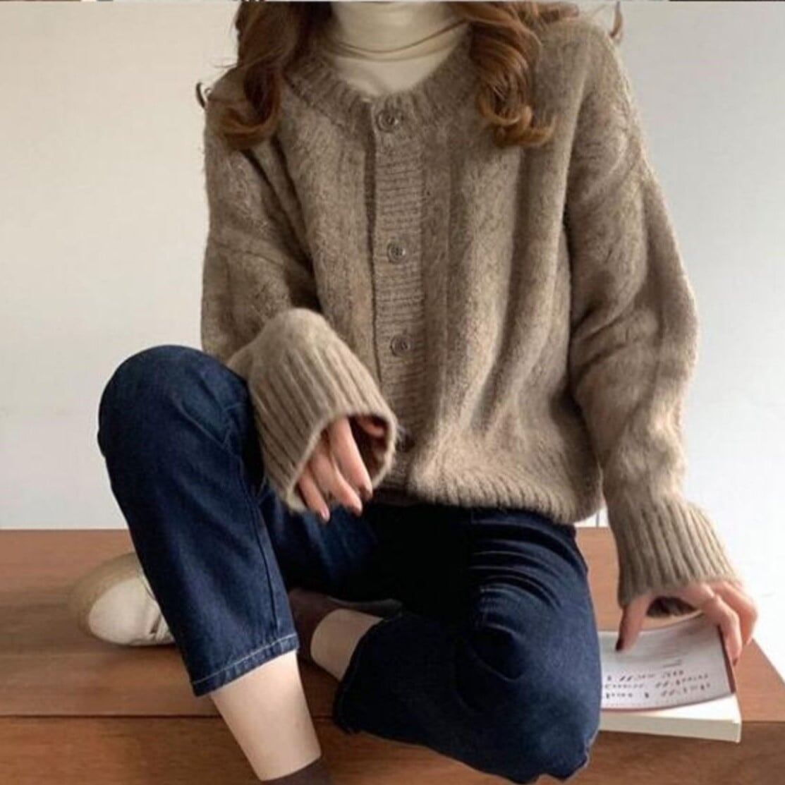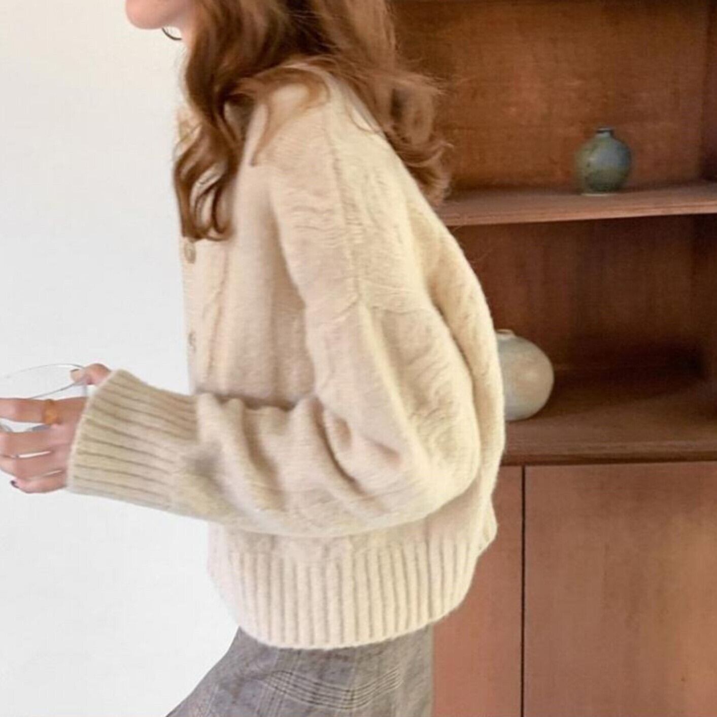 送料無料 レディース 厚手ケーブルニットカーディガン ショート丈 長袖 無地 ラウンドネック ラテカラー 秋冬 カジュアル 韓国ファッション トップス