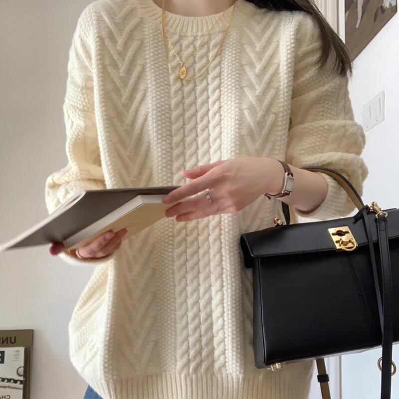 送料無料 レディース ケーブルニットセーター ラウンドネック フリーサイズ 20代30代40代ママ 春秋冬 大人カジュアル シンプル 着回し