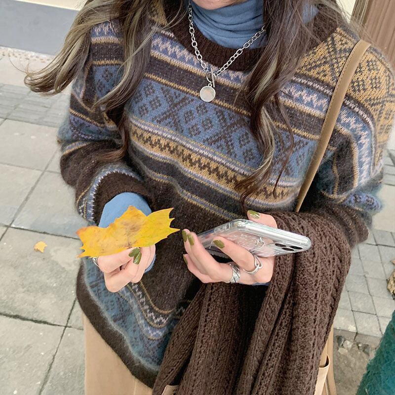 送料無料 レディースニットセーター ラウンドネック長袖トップス 春秋冬 韓国ファッション 大人カジュアル ブラウン 20代30代40代 ママさん