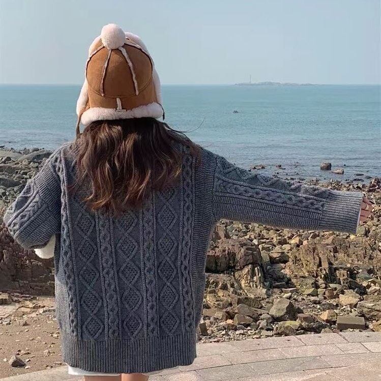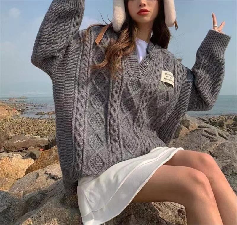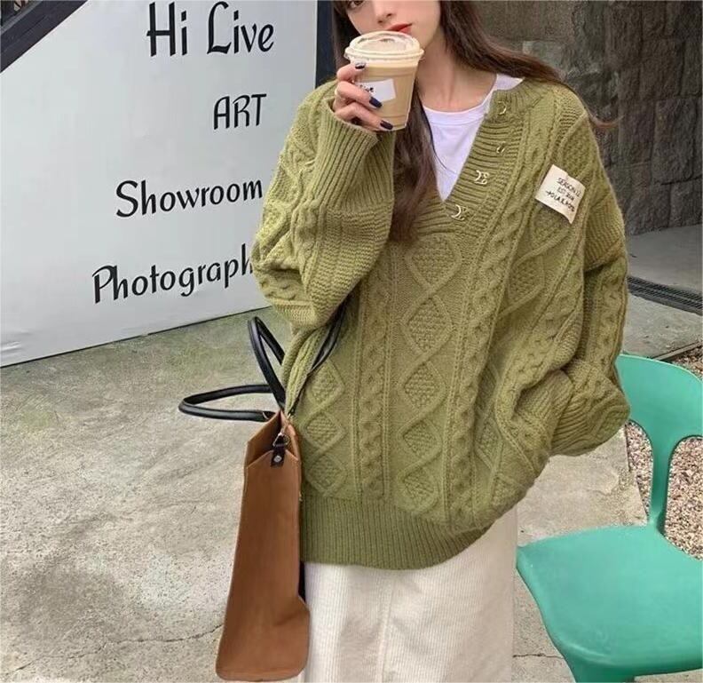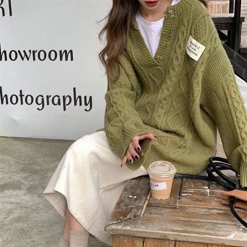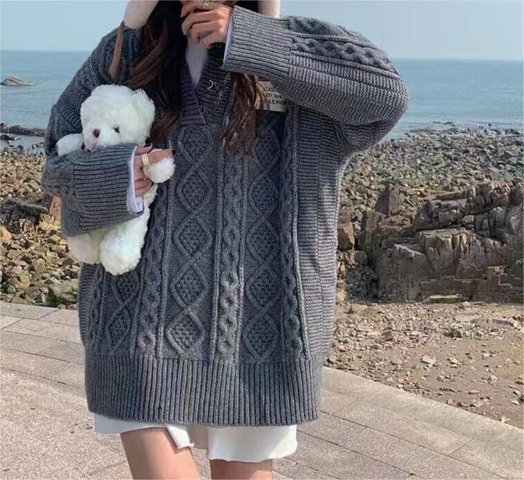 送料無料 レディースVネックニットセーター 無地 ルーズミドル丈 春新作 春秋冬 フリーサイズ 韓国ファッション 体型カバー 20代〜40代