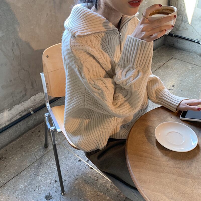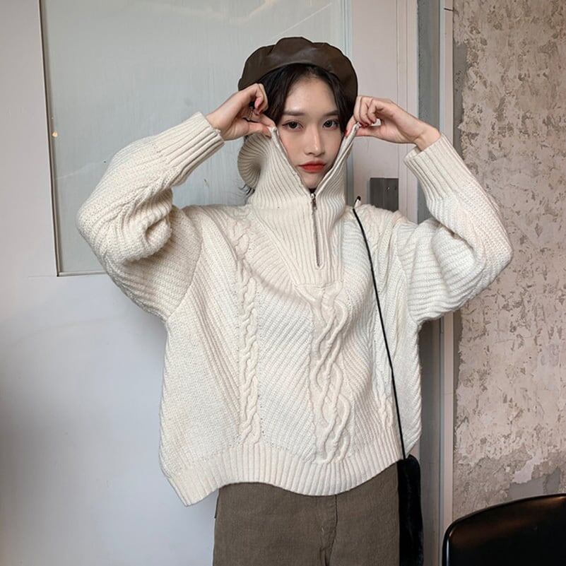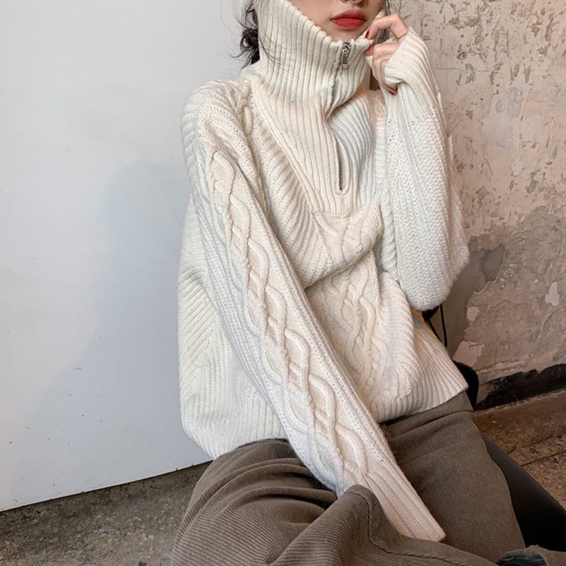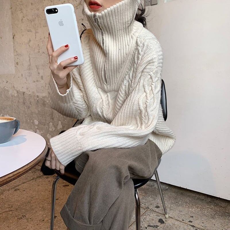 送料無料 レディース ハイネック ニットプルオーバー ジッパー付き ゆったりシルエット ロングスリーブ 春秋冬 きれいめ 韓国ファッション