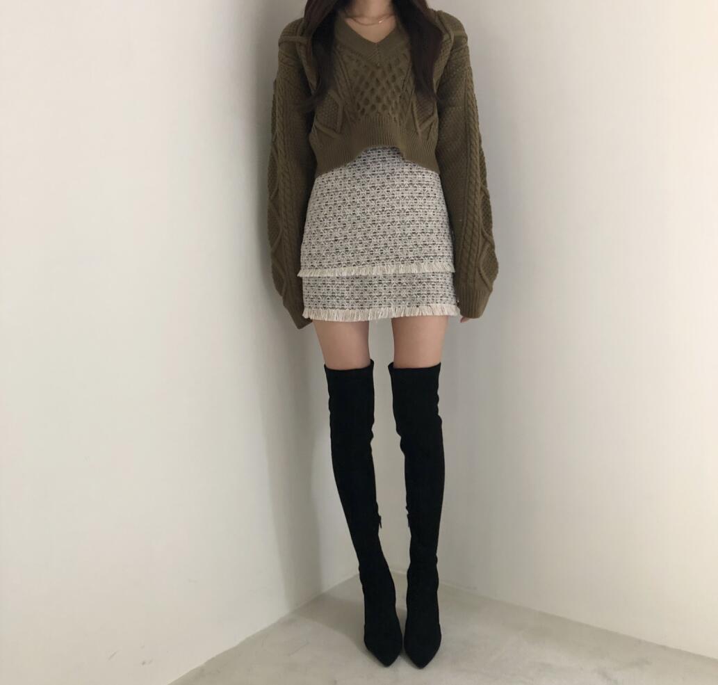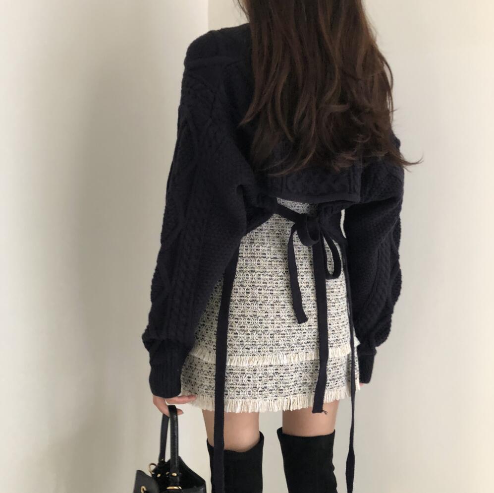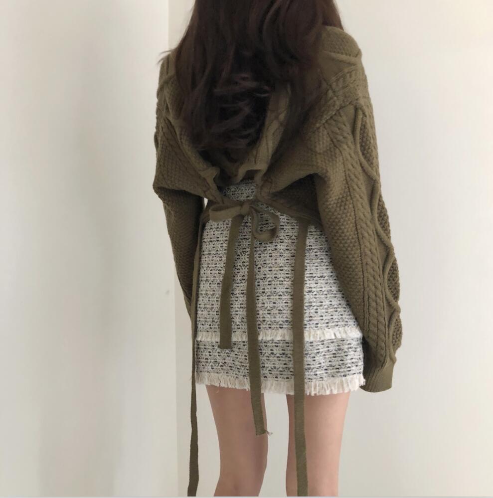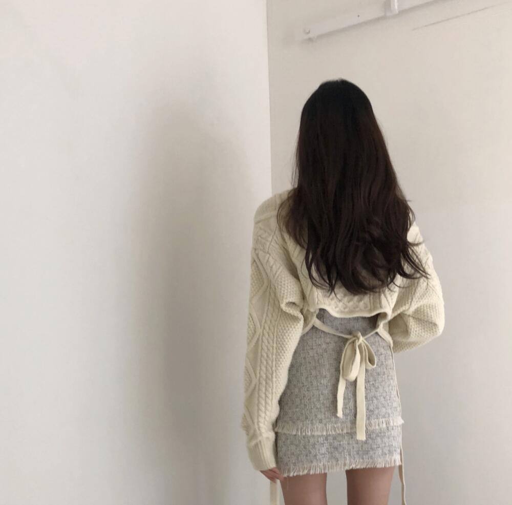 送料無料 秋新作 韓国ファッション アランケーブルVネックショート丈ニットセーター レディース 春秋冬 トップス グリーン ブラック ベージュ