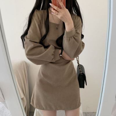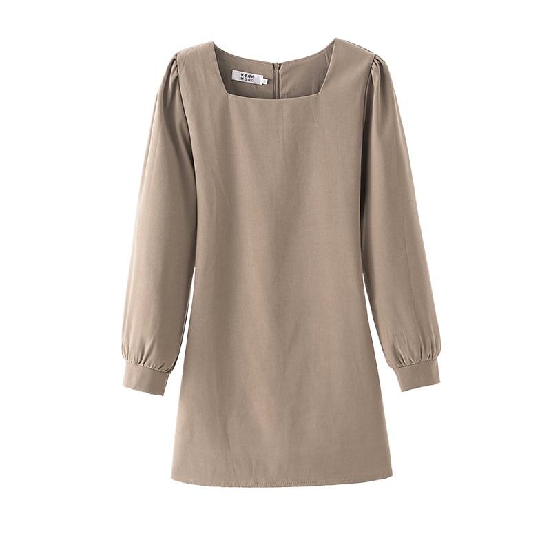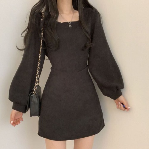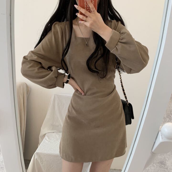 送料無料 レディース韓国風ミニ丈タイトワンピース シンプル無地長袖 美シルエット ワントーン カジュアル ベージュ ブラック 春秋冬 デート 女子会