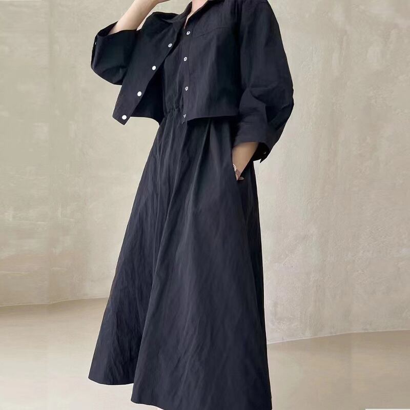 送料無料 春新作 2way長袖シャツ×ノースリーブフレアワンピセット 無地ベージュ ブラック シンプル 大人可愛い 20代30代40代マタニティ