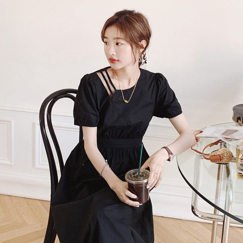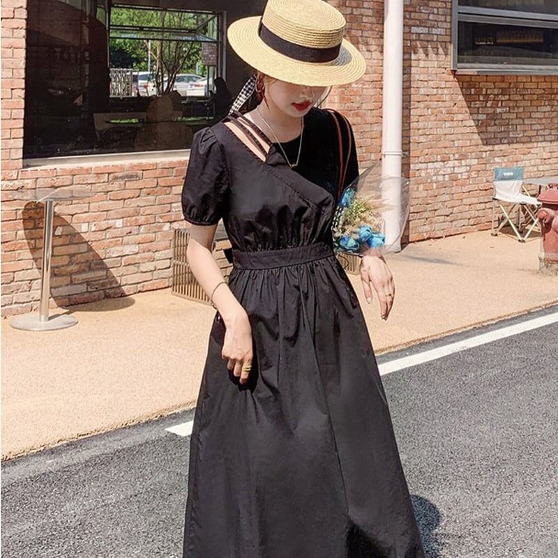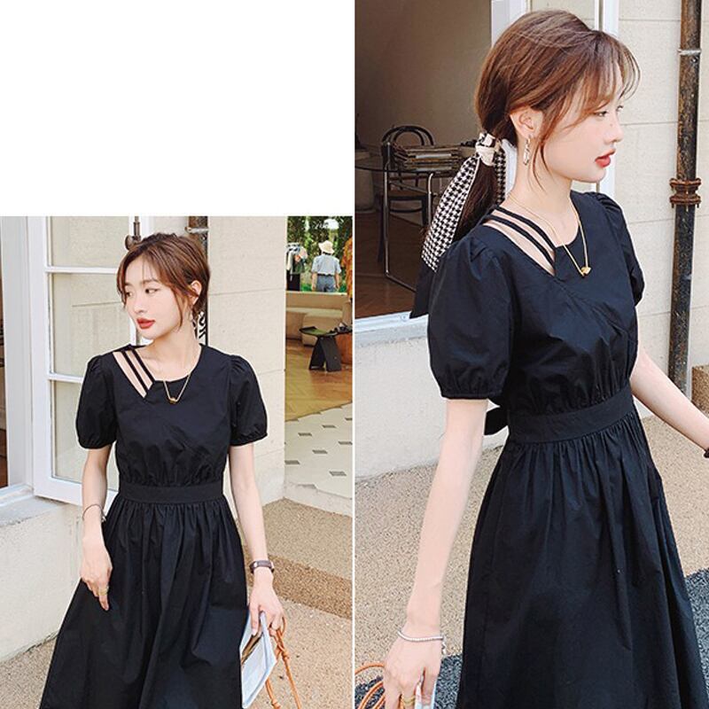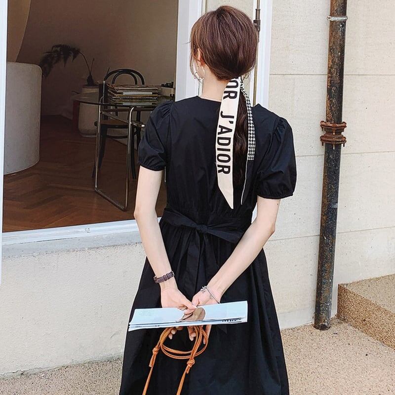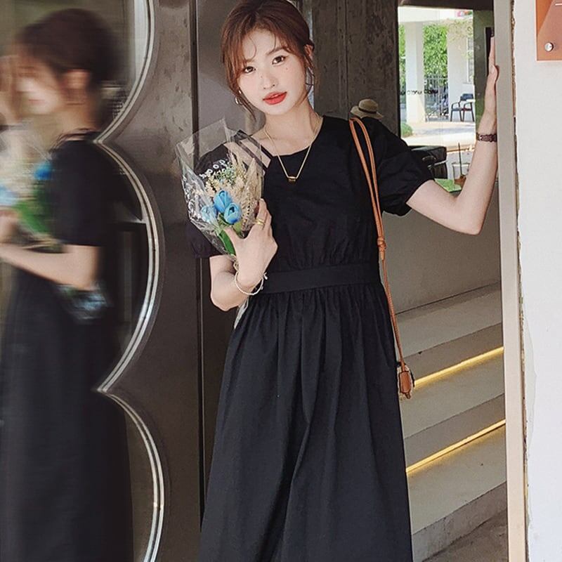 送料無料 ワンピース きれいめフレアAライン リボン付き半袖 ブラック レディース マタニティ 大きいサイズ 膝下丈 春夏秋 韓国ワンピース