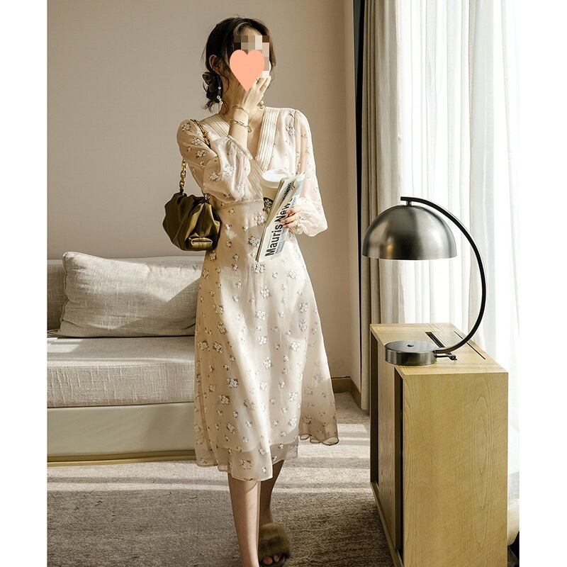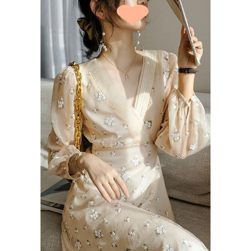 送料無料 春新作 春夏韓国シシアーシフォンロングワンピース Aライン 長袖 マタニティ 大きいサイズ レディース 花柄 大人可愛い 春秋 20代30代