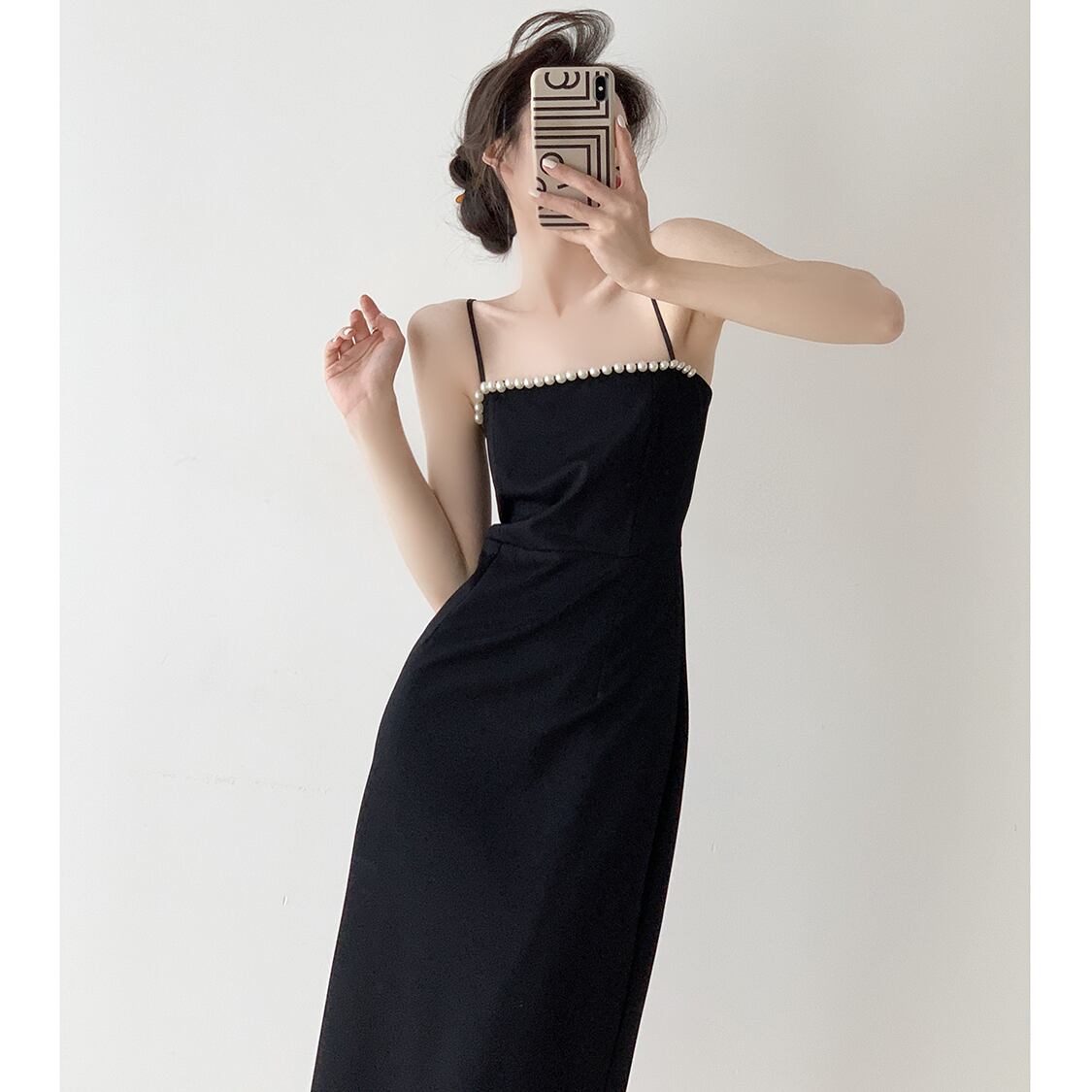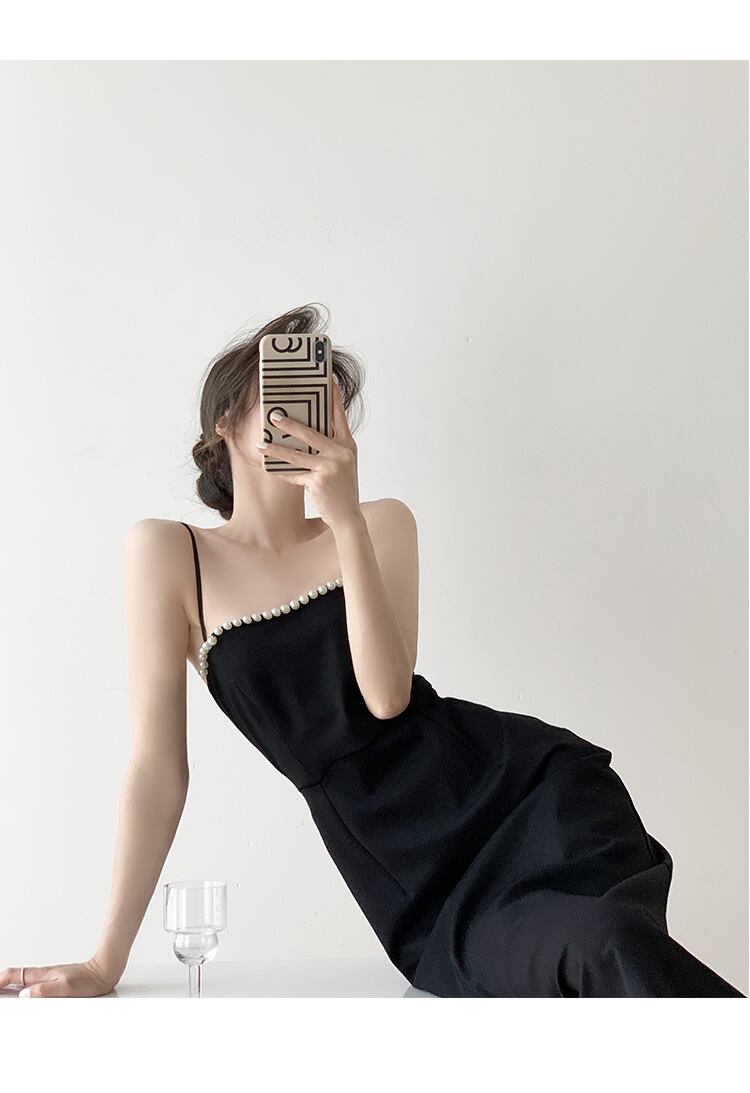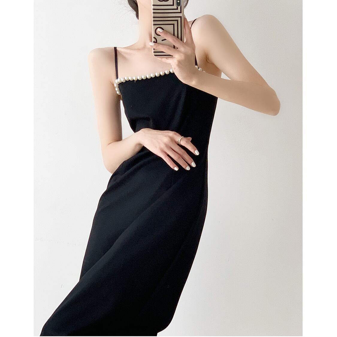 エレガントなパールアクセントが魅力的なミディ丈ワンピース。