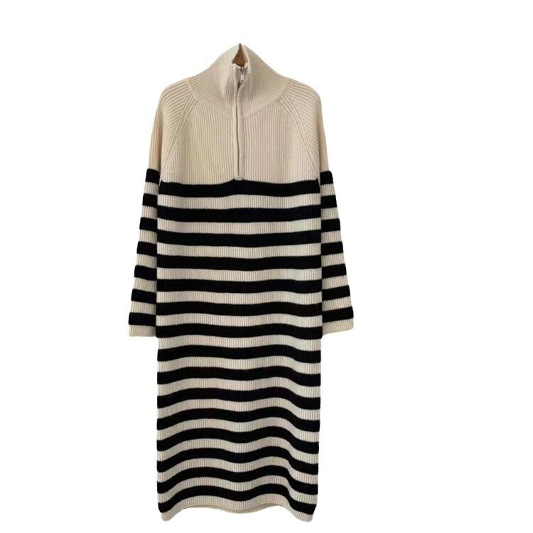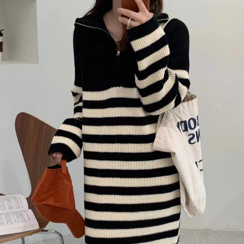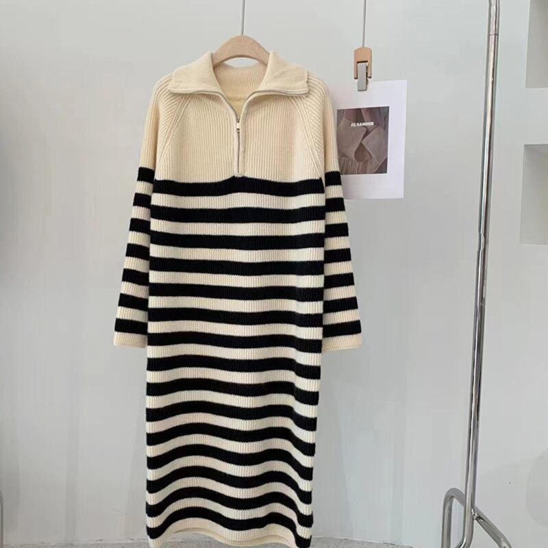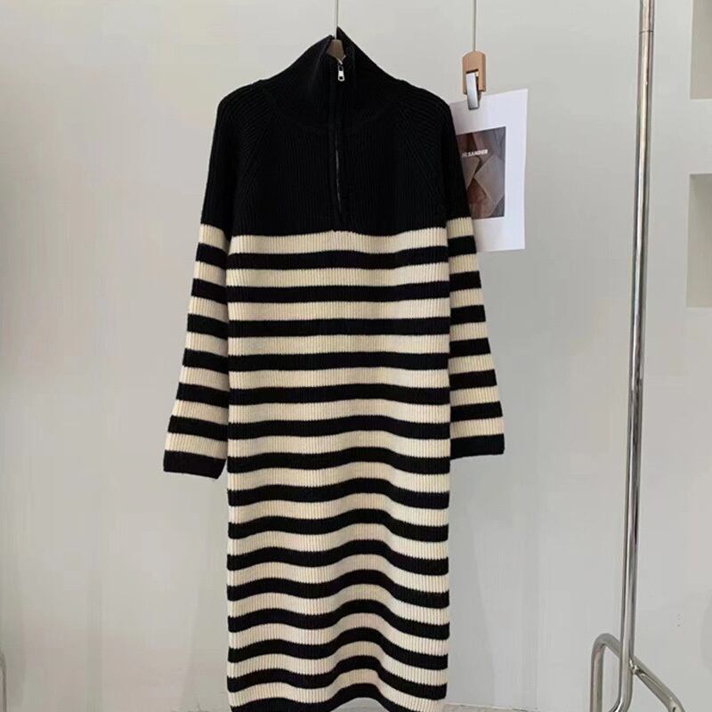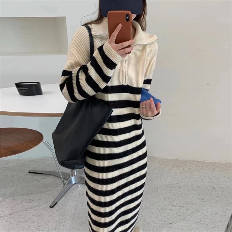 送料無料 ワンピース 春 秋 冬 ロング ボーダー ワンピース ロングワンピース レディース 韓国ワンピース 20代 30代 カジュアル ブラック ホワイト 襟