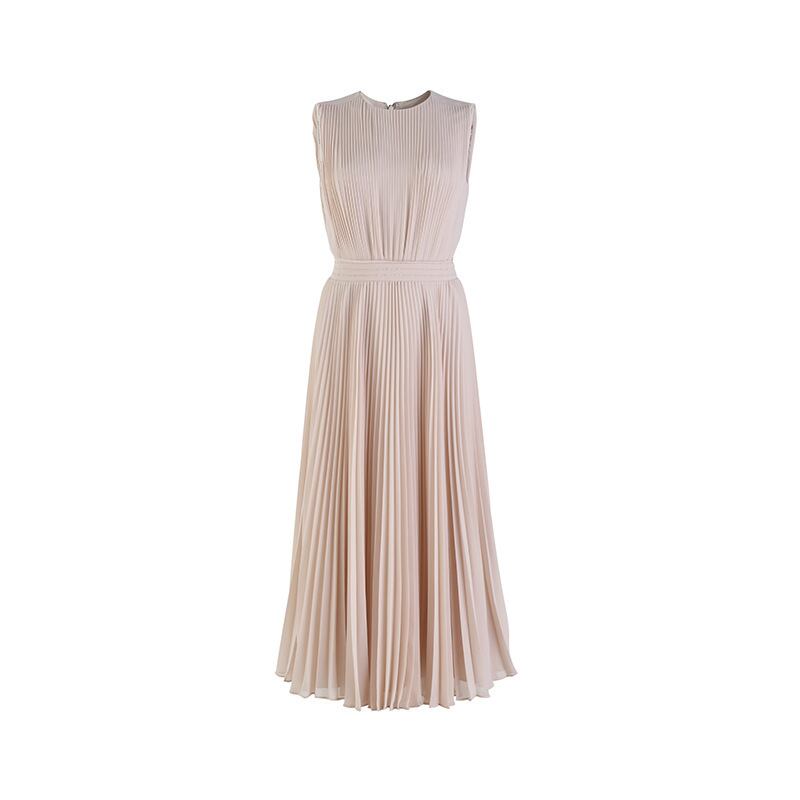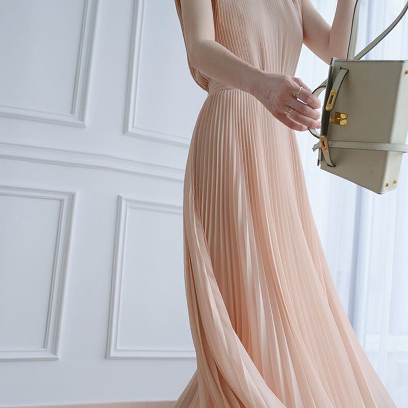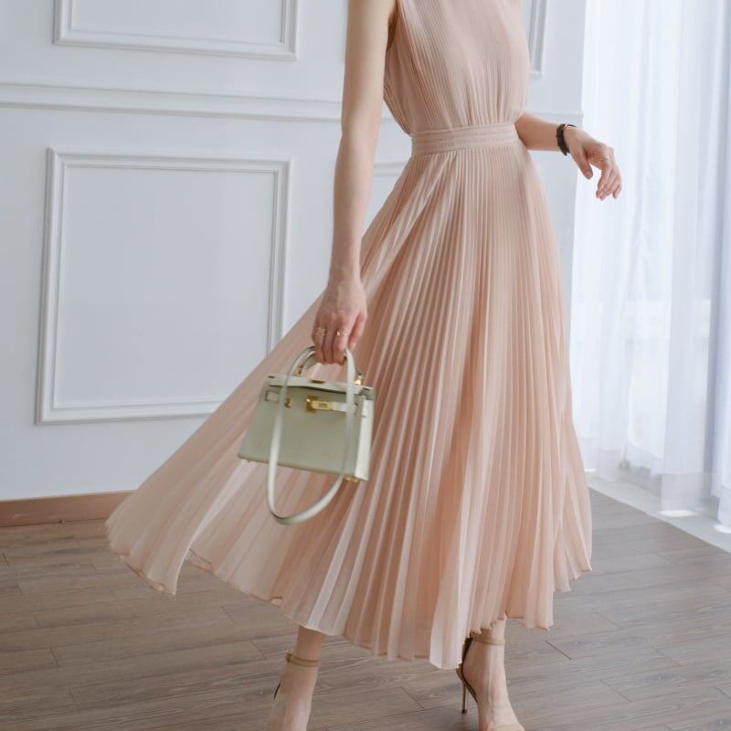 上品なプリーツが魅力のロングワンピ。
