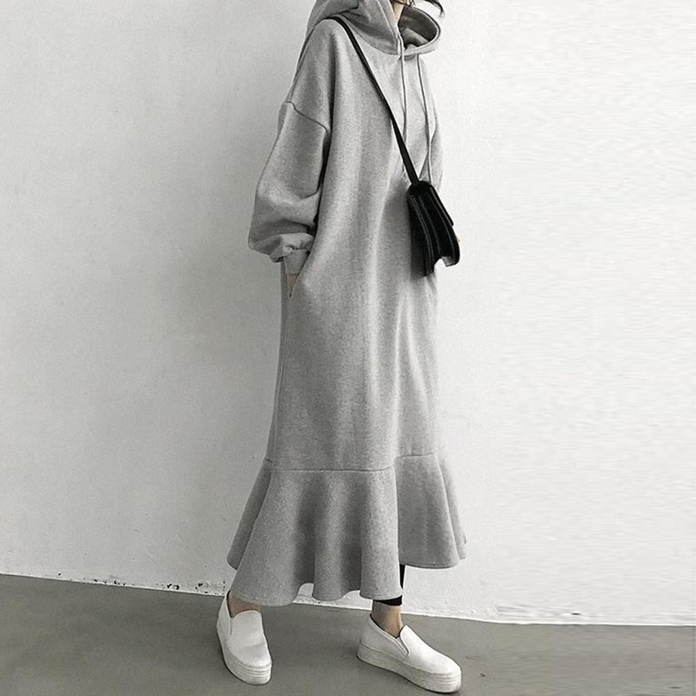 送料無料 ワンピース 春 秋 冬 ロング 無地 ロングワンピース フリーサイズ レディース ロング丈 長袖 韓国ワンピース ブラック グレー フード付き カジュ