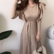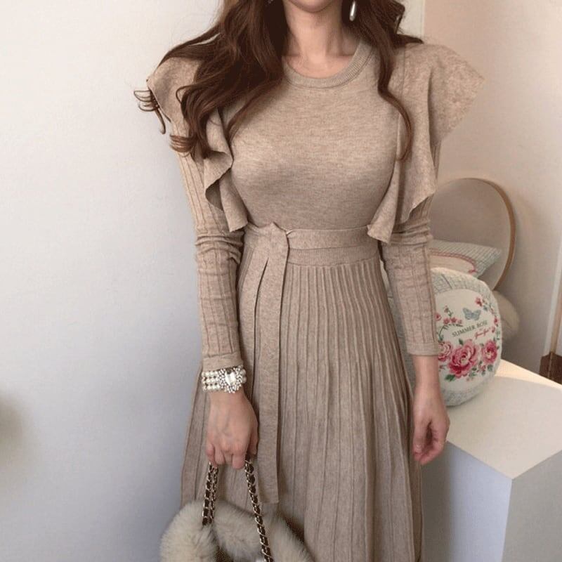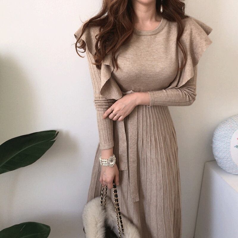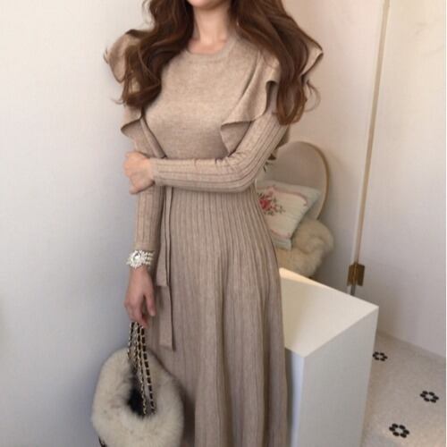 送料無料 ワンピース 春 秋 冬 フリル ロング マタニティ 無地 ロングワンピース レディース ロング丈 長袖 ニットワンピース 韓国ワンピース 20代 30
