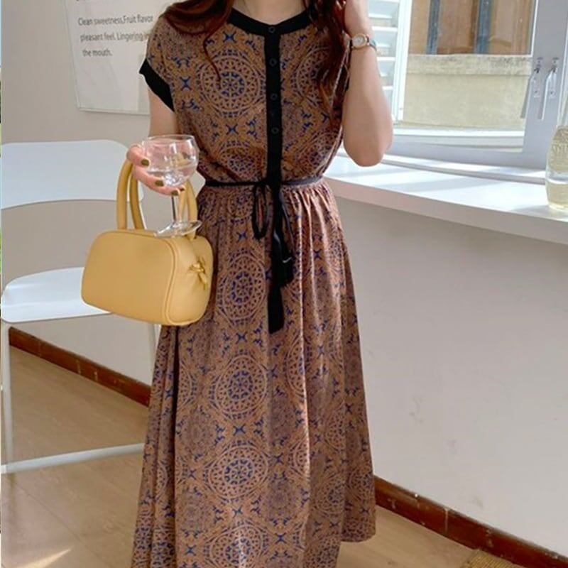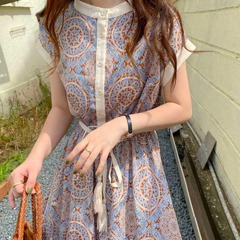 送料無料 春新作 ワンピース 春 夏 ロング マタニティ 幾何学模様 ロングワンピース レディース ロング丈 フレンチスリーブ 半袖 韓国ワンピース ドレス 春