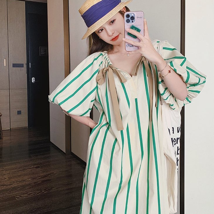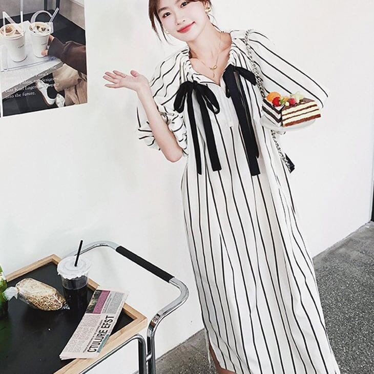 軽やかで女性らしい、ストライプ柄のマタニティワンピース。