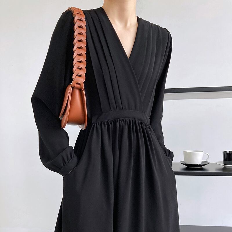 大人可愛いスタイルを楽しむ無地ロングワンピース。