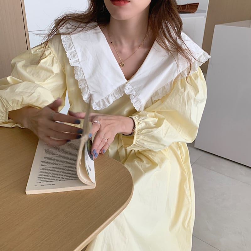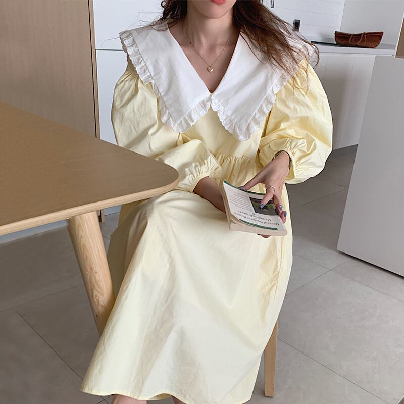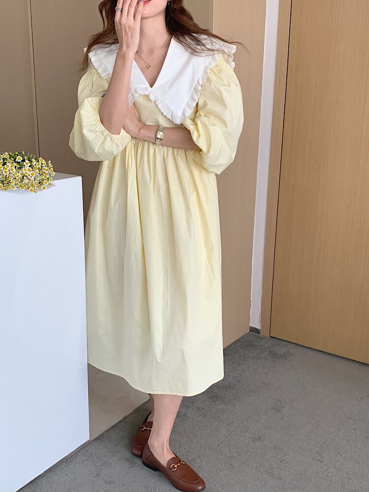 送料無料 ワンピース 春 ワンピース 夏 ワンピース 大きな襟 イエロー ロング ワンピース マタニティ ワンピース ロング ワンピース ロング丈 長袖 韓国