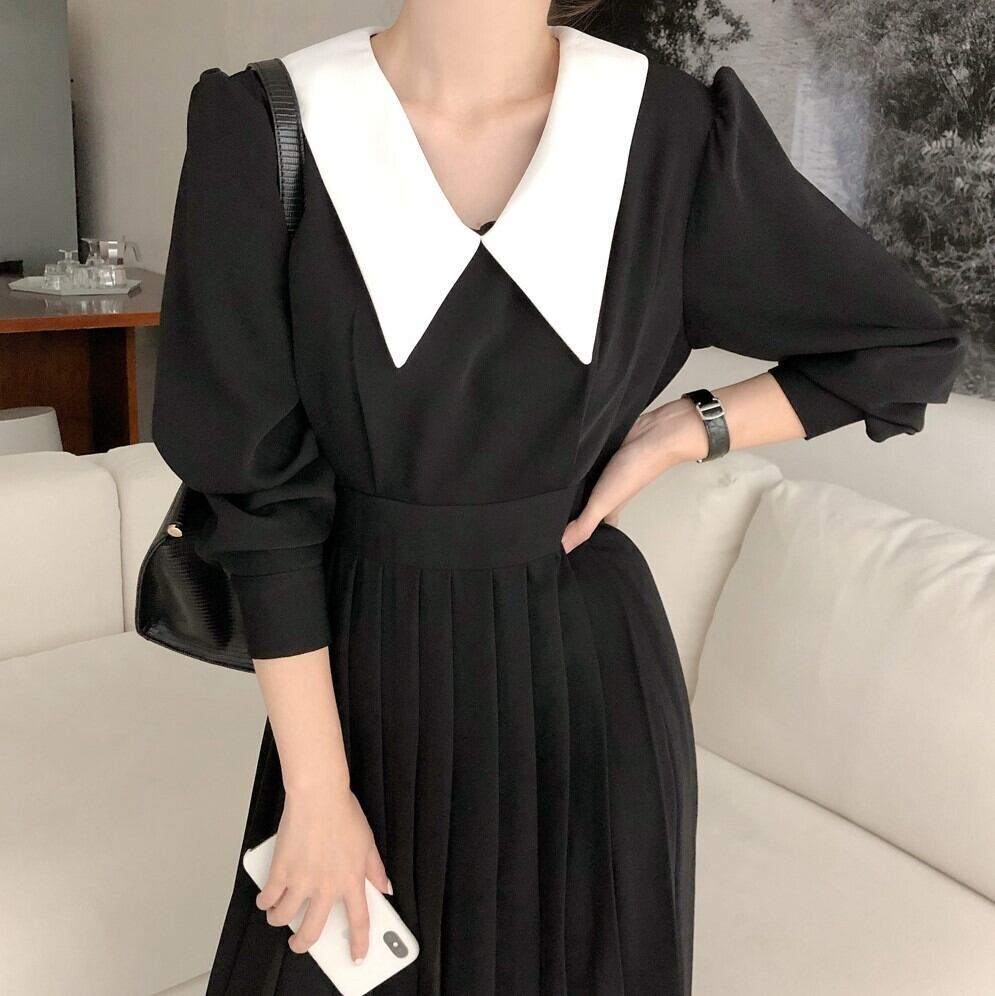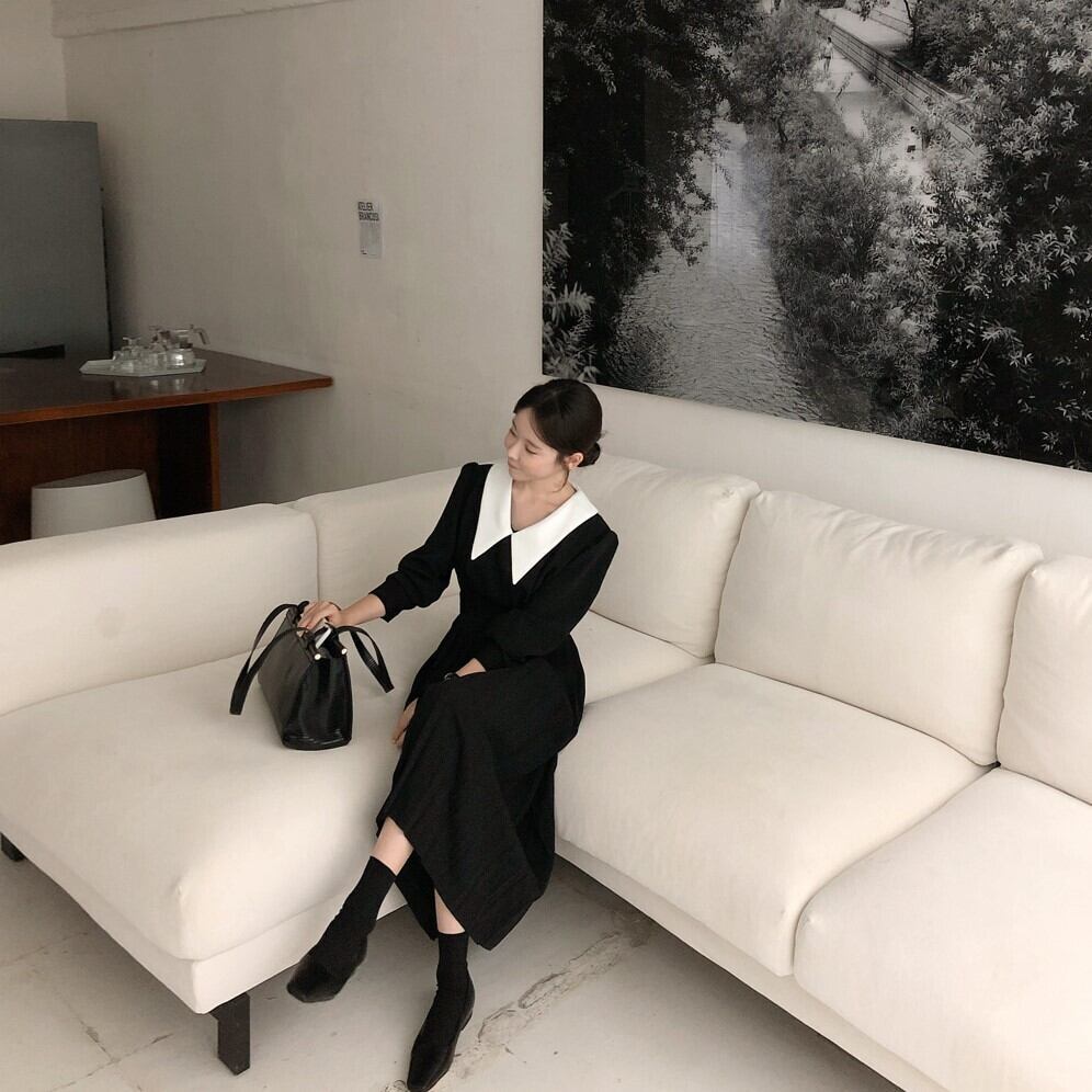シックな黒で魅せる、フェミニンなロングワンピース。