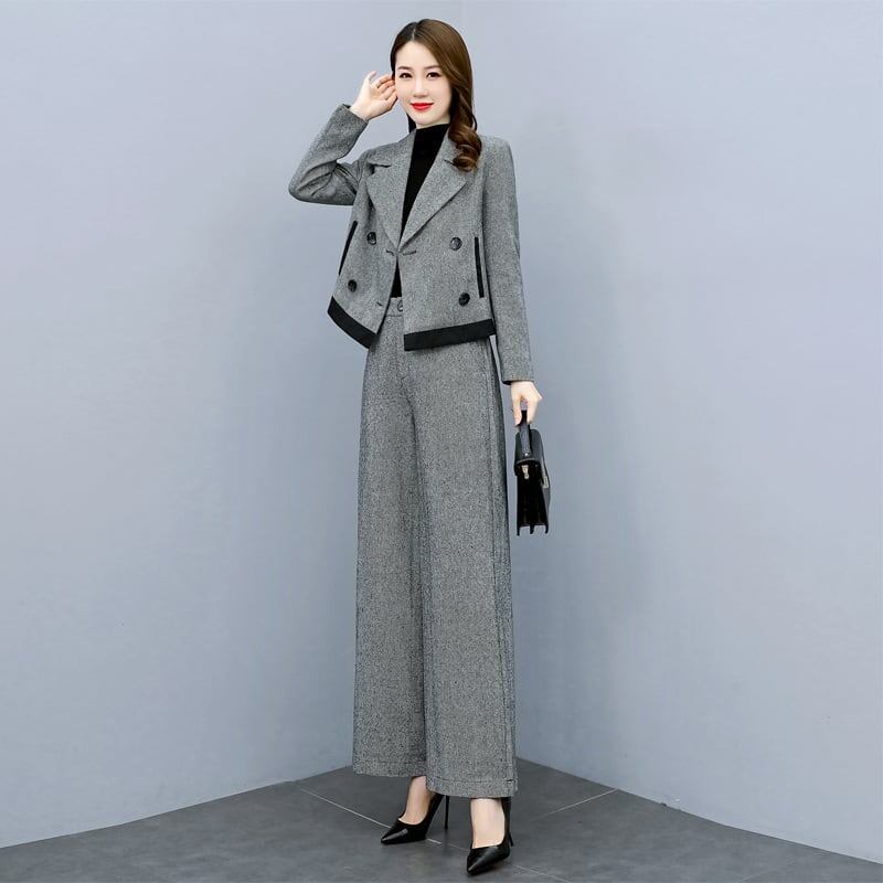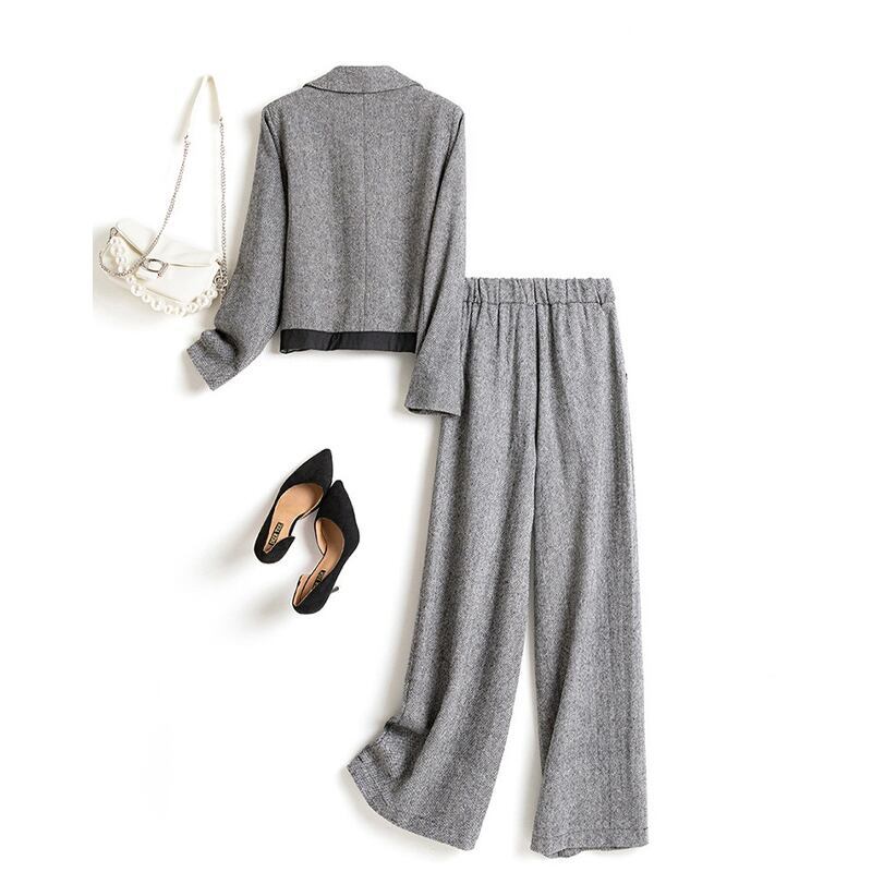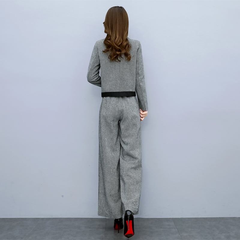 洗練されたグレーのパンツドレスで、一歩先を行くスタイルを実現。
