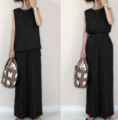 体型カバーも叶えるワイドパンツとノースリーブの組み合わせ。