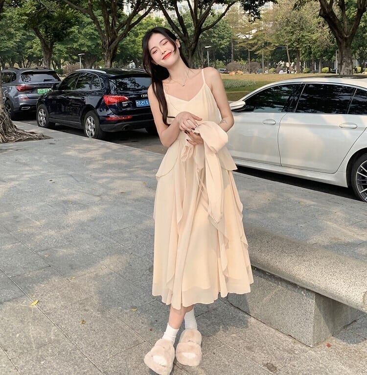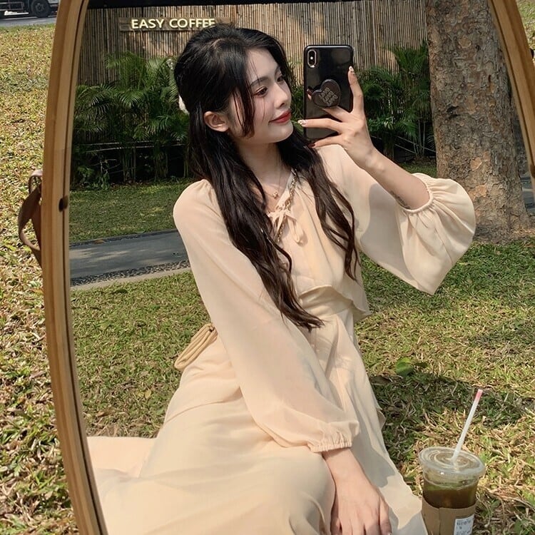 春の風を感じる、シフォン素材の2WAYロングワンピース。