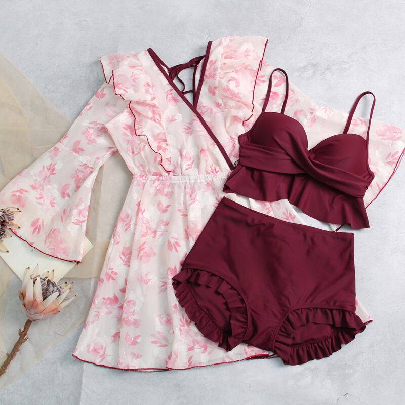送料無料 水着 ビキニ 水着ビキニ 3点セット 韓国 水着 スカート付き マイクロビキニ 20代 30代 無地 リゾート 体型カバー グレー ピンク 花柄
