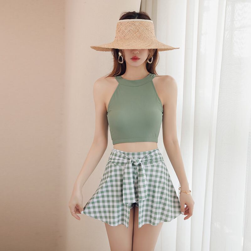 送料無料 水着 ビキニ 水着ビキニ 2点セット 韓国 水着 スカート付き マイクロビキニ グリーン 20代 30代 無地 チェック プール 海 温泉 体型カバー