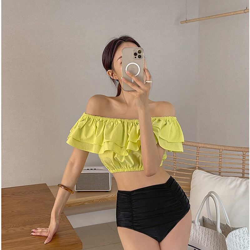 送料無料 水着 ビキニ 水着ビキニ 2点セット 韓国 水着 マイクロビキニ チェック柄 イエロー ホワイト ブラック フリル ワンショルダー セパレート 20代