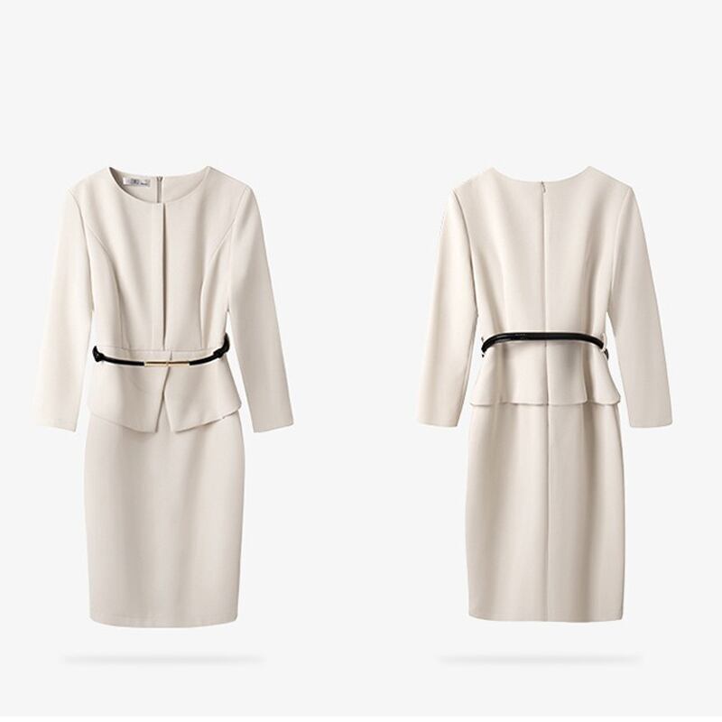 お呼ばれに最適な袖ありデザインと膝丈仕立て。