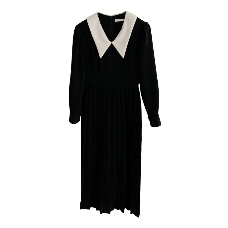 【送料無料】 ワンピース ロング丈 袖あり l Vネック 襟付き プリーツ ウエストマーク 伸縮性 薄手 大人可愛い シンプル 上品 おしゃれ お洒落 レトロ ガーリー 個性的 存在感 無地 秋 10代 20代 30代 レディース 女性用 ママ デート お出かけ 女子会 休日 コーデ 楽ちん 黒 ブラック