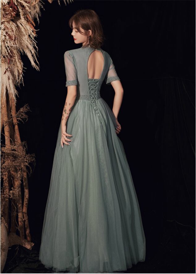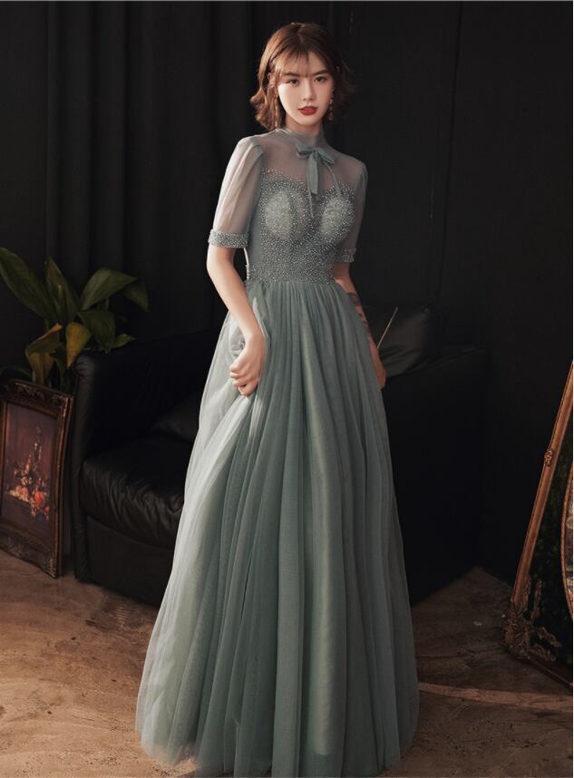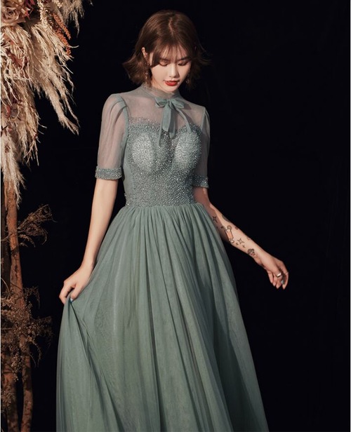 【送料無料】 ドレス レディース パーティードレス l カジュアル ロング Aライン シフォン 透け感 シースルー ボトルネック リボン ビーズ キラキラ 柔らかい ふんわり 袖あり 5分袖 くすみカラー シアー かわいい 大人可愛い エレガント 大きいサイズ 2XL 3XL 小さいサイズ XS セミフォーマル お呼ばれ 披露宴 発表会 二次会 二の腕カバー グリーン 緑 薄緑 春 夏 秋 冬 10代 20代 イベント 衣装 華やか ガーリー 背中開き バックシャン おしゃれ